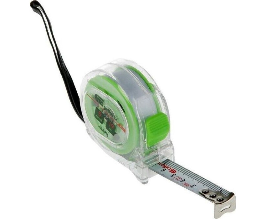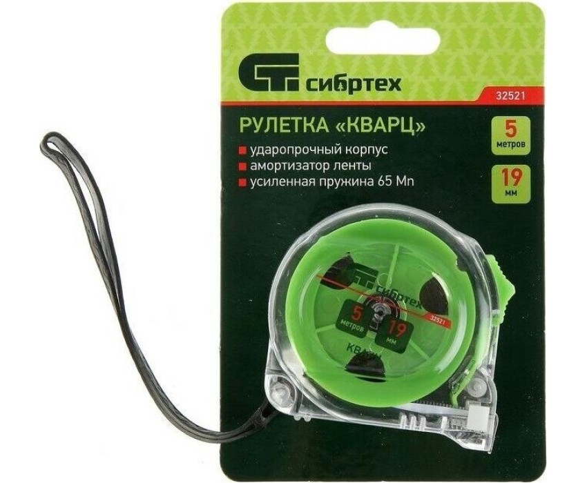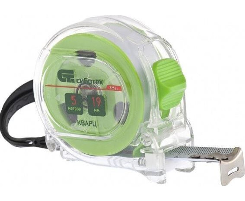 Рулетка Сибртех Кварц 32521 с полотном размером 5 м х 19 мм, в прозрачном корпусе, с амортизатором, будет полезна для измерения длины конструкций, строительных материалов и т.д. Пригодится на строительной площадке, в гараже, мастерской и в быту.ПреимуществаДолговечность и надежность — корпус из поликарбоната с амортизатором защищен от внешних воздействий и не разрушается при быстром возврате ленты.Работа в труднодоступных местах — ширина полотна составляет 19 мм.Подвижной зацеп True-zero — толщина зацепа компенсируется для повышения точности измерений.Удобная упаковка — рулетка поставляется в картонной подвесной карте.Безопасная эксплуатация — рулетку можно подвесить за ремешок на запястье для предотвращения ее падения во время работы.