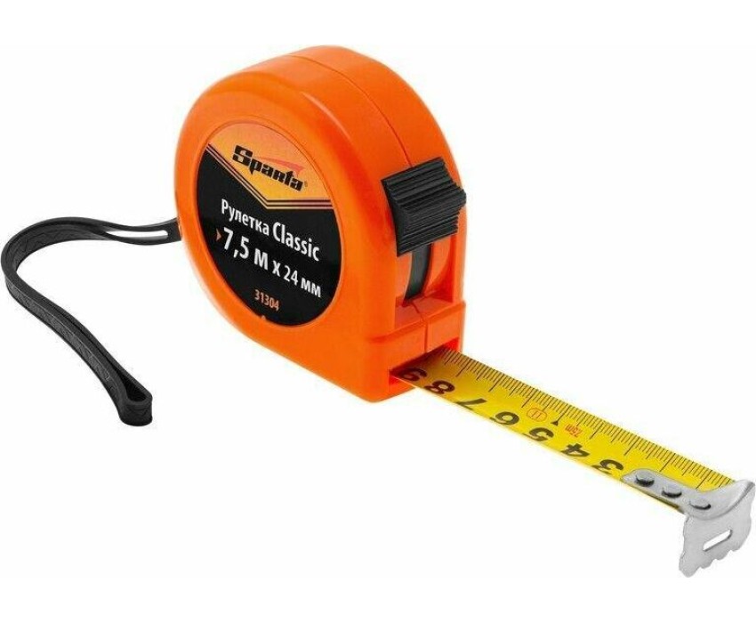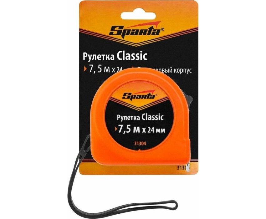 Рулетка Sparta «Classic» 31304 с полотном 7,5 м х 24 мм, в пластиковом корпусе, станет незаменимым помощником в хозяйстве при измерении длины и ширины деталей, заготовок, материалов, мебели и т.д. Она рассчитана на бытовое использование. За счет специального окошка на зацепе рулетка подходит для применения в качестве циркуля.ПреимуществаДолговечность — корпус выполнен из прочного пластика, лента покрыта краской.Точность измерений до миллиметра — плавающий зацеп обеспечивает совпадение нулевой отметки с краем детали.Надежность — зацеп крепится к ленте на три заклепки.Механический стопор — ленту можно удерживать на нужной длине.Удобство работы — на полотно нанесена крупная шкала, которую хорошо видно на расстоянии.Возможность работы на высоте — рулетка оснащена ремешком и клипсой для транспортировки на запястье и ремне.