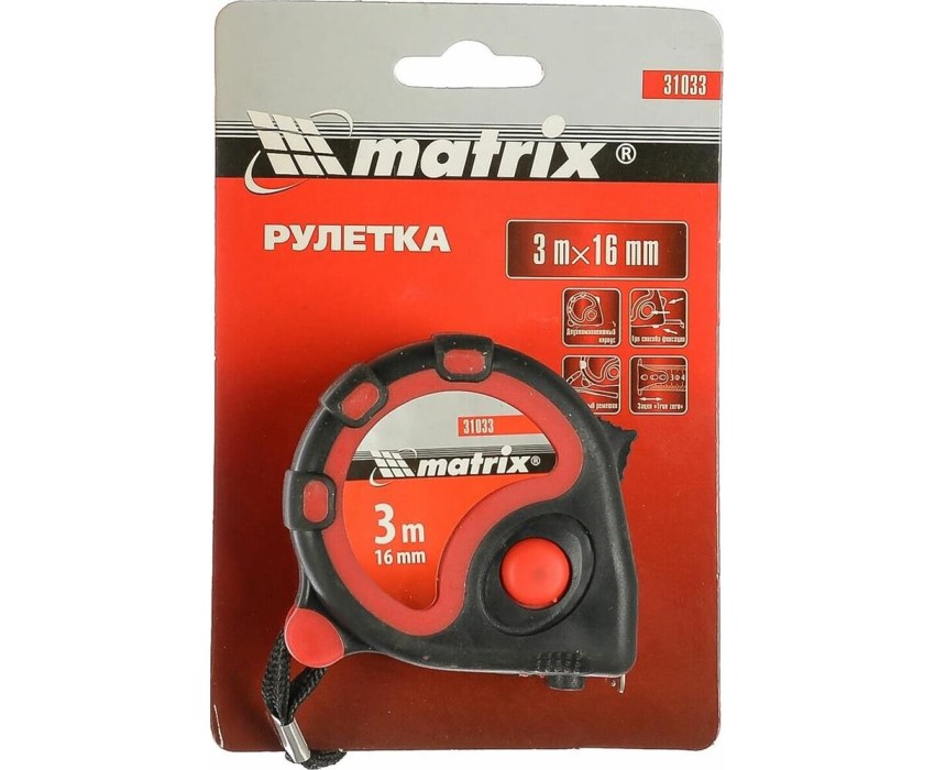 Рулетка Matrix Status magnet 3 fixations 31004, 3 м х 16 мм, в обрезиненном корпусе, оснащенная зацепом с магнитом, предназначена для измерения различных объектов и расстояний. Имеет класс точности 2 и цену деления 1 мм, что обеспечивает достаточную результативность замеров. Магнитный зацеп позволяет четко фиксировать измерительное полотно на металлических предметах. Функция «true zero» повышает точность расчетов, поскольку нивелирует погрешность в виде толщины самого зацепа. Рулетка будет полезна при проведении строительных работ, а также пригодится в быту.ПреимуществаКорпус из высокопрочного ABS-пластика обрезинен, что снижает риск поломки инструмента в случае падений или ударов.Зацеп закреплен на ленте 2 заклепками и не отвалится во время работы.Лента может фиксироваться на нужной длине при помощи 3 независимых механизмов, что упрощает проведение измерений.Цифры измерительной шкалы крупные — это делает работу с инструментом более комфортной.Шнурок для крепления на запястье уменьшает риск падения рулетки.На боковой поверхности имеется зажим, при помощи которого рулетку можно закрепить на поясном ремне.