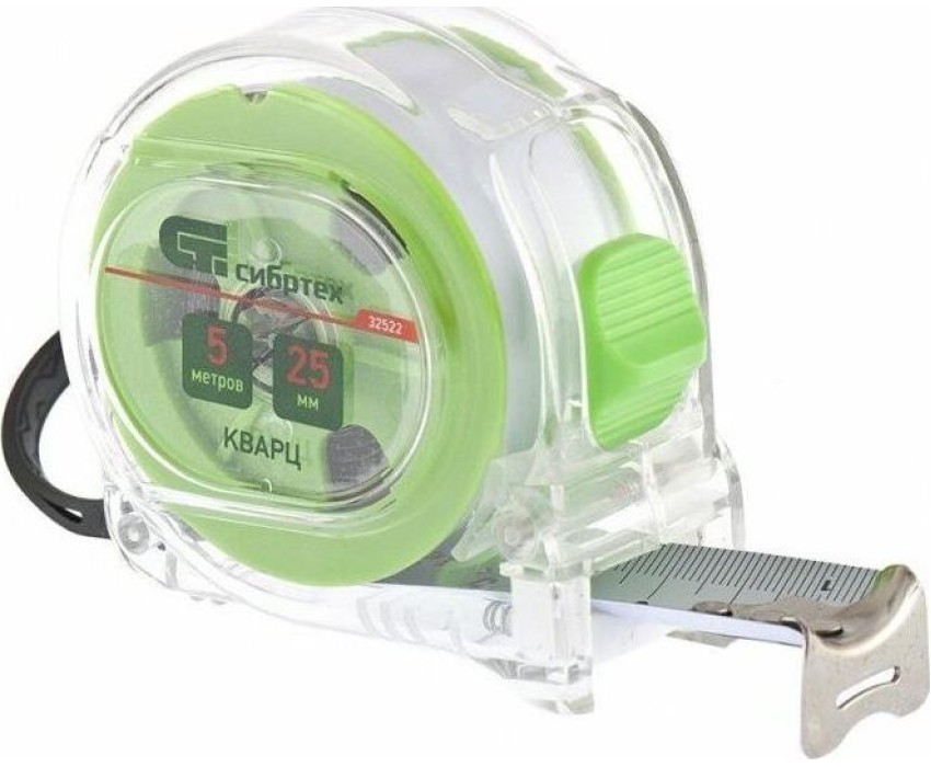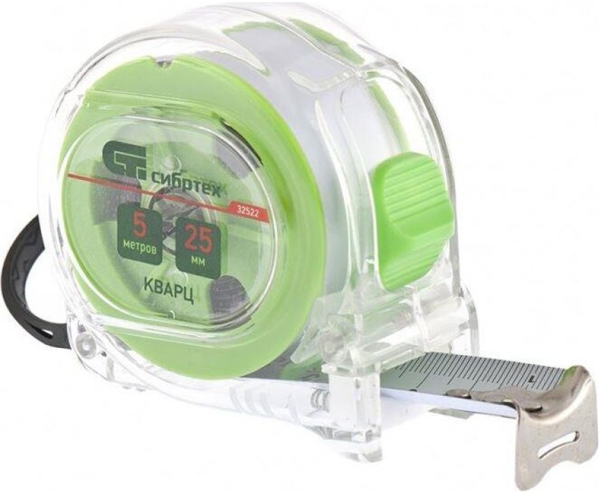 Рулетка Сибртех Кварц 32522 с полотном размером 5 м х 25 мм, в прозрачном корпусе, с амортизатором, будет полезна для измерения длины конструкций, строительных материалов и т.д. Пригодится на строительной площадке, в гараже, мастерской и в быту.ПреимуществаДолговечность и надежность — корпус из поликарбоната с амортизатором защищен от внешних воздействий и не разрушается при быстром возврате ленты.Подвижной зацеп True-zero — толщина зацепа компенсируется для повышения точности измерений.Удобная упаковка — рулетка поставляется в картонной подвесной карте.Безопасная эксплуатация — рулетку можно подвесить за ремешок на запястье для предотвращения ее падения во время работы.