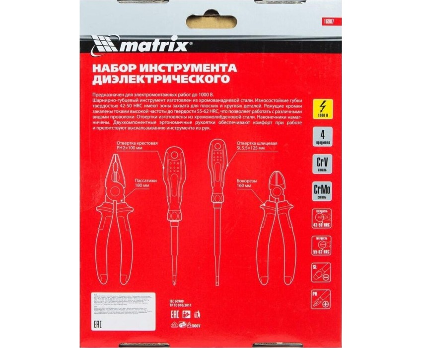 Предназначен для электромонтажных работ до 1000 В.Щарнирно-губцевый инструмент изготовлен из хромованадиевой стали.Износостойкие губки твердостью 42-50 HRС имеют зоны захвата для плоских и круглых деталей.Режущие кромки закалены токами высокой частоты до твердости 55-62 HRC, что позволяет работать с различными видами проволоки.Отвертки изготовлены из хромомолибденовой стали. Наконечники намогничены.Двухкомпонентные эргономичные рукоятки обеспечивают комфорт при работе и препятствуют выскальзыванию инструмента из рук.КомплектацияОтвертка крестовая РН2х100 ммОтвертка шлицевая SL5,5х125 ммПассатижи 180 ммБокорезы 160 мм.