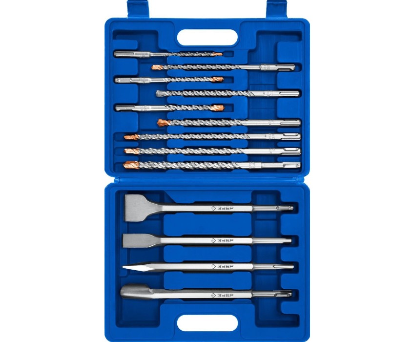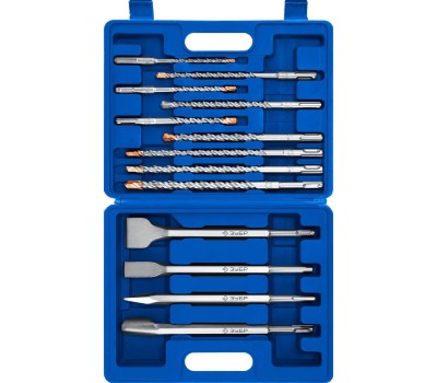 Набор зубил и буров ЗУБР - набор профессионала для работ любой сложности. Преимущества Повышенный ресурс зубил и буров. Твердосплавная пластина буров из сплава ВК85 с двумя резцами и центрирующим наконечником для быстрого эффективного сверления. Спираль буров 4С с усиленным сердечником обеспечивает оптимальное соотношение между устойчивостью к излому бура и быстрым отводом шлама, подавляет вибрацию и способствует лучшей передаче энергии удара непосредственно на твердосплавный резец. Индукционная трехступенчатая закалка со строгим соблюдением температур в каждой зоне при термообработке для повышения стойкости и увеличения рабочего ресурса инструмента Зубила изготовлены из высокопрочной легированной стали что гарантирует их продолжительный срок службы Высокая устойчивость зубил по отношению к ударам и динамическим нагрузкам Шлифованная шестигранная форма зубил Износостойкое покрытие защищает от коррозии Использование Буры применяются при сверлении отверстий в бетоне, граните, кирпичной кладке, камне и твердых известняках. Зубила предназначены для ремонта, реконструкции, долбежных и демонтажных работ по бетону, камню, кирпичу. Используется с перфораторами SDS-plus.