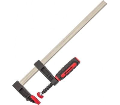 F-образная струбцина Matrix 20405 размером 300 х 50 х 370 мм используется для зажима металлических, деревянных и других заготовок для их последующей обработки или сборки. Представляет собой штангу, на которой установлено 2 кронштейна — неподвижный и подвижный. Деталь помещается между ними и прижимается к губкам при помощи винтового зажима с трапециевидной резьбой. Подвижный кронштейн позволяет регулировать величину захвата, которая может достигать 300 мм. Струбцину применяют для выполнения слесарных и столярных работ.ПреимуществаНадежность — стальная штанга выдерживает повышенные нагрузки и позволяет фиксировать заготовки со значительным усилием.Аккуратная работа — пластиковые накладки на губках предотвращают повреждение детали при сжатии.Возможность использования для сварочных работ — металлическая конструкция выдерживает высокую температуру (перед началом сварки необходимо снять пластиковые накладки с губок).Эргономичность — двухкомпонентная обрезиненная рукоятка с рельефным дизайном не выскальзывает из ладони.