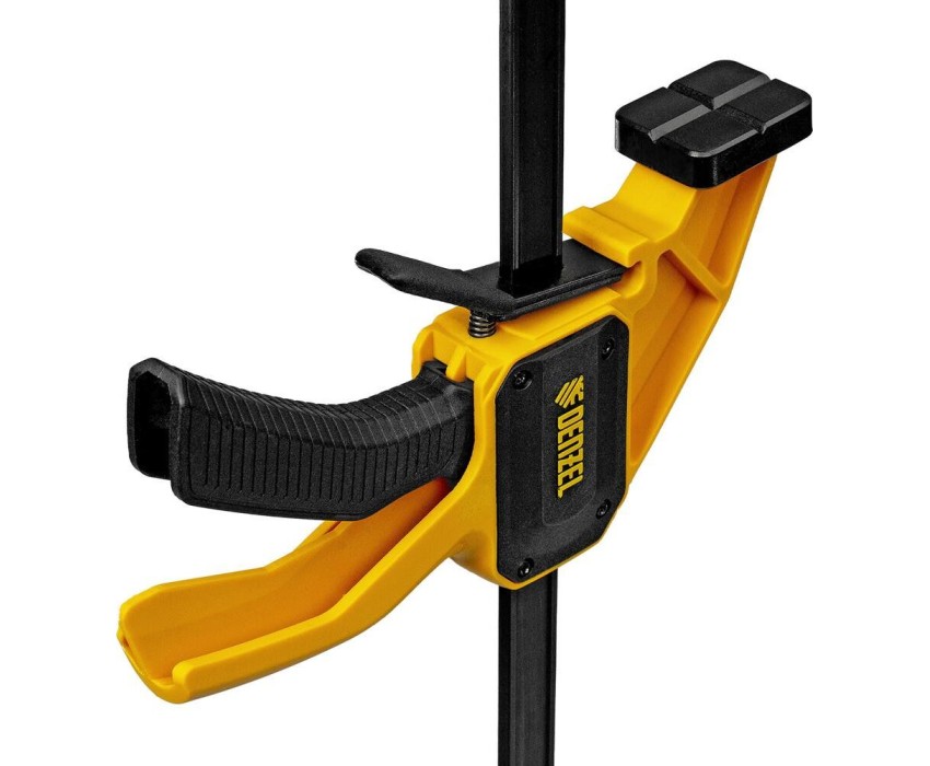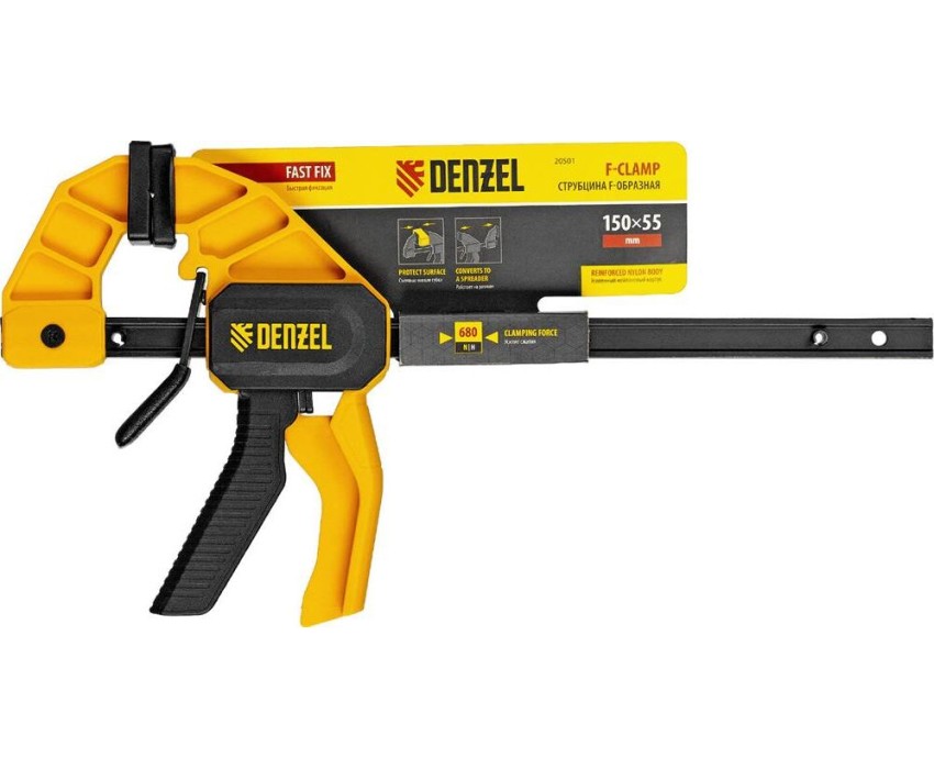 Струбцина F-образная быстрозажимная Denzel 20501 с пошаговым зажимом шириной 150 мм и глубиной 55 мм, с усиленным нейлоновым корпусом, позволяет прочно зафиксировать детали для их обработки, склеивания и выполнения других задач. Сила сжатия составляет 680 Н. Струбцина подходит для бытового и профессионального применения.ПреимуществаУсиленная конструкция — нейлоновый корпус устойчив к ударным нагрузкам и падениям с небольшой высоты.Увеличенная жесткость и прочность — направляющая выполнена из двутаврового стального профиля и закалена.Аккуратная работа с любыми материалами — съемные мягкие губки позволяют зафиксировать деталь без риска повреждения и деформации.Расширенный функционал — переставные губки позволяют использовать струбцину на разжим.Комфортное использование — струбцина весит всего 290 г, обрезиненная кнопка фиксации обеспечивает удобный захват.