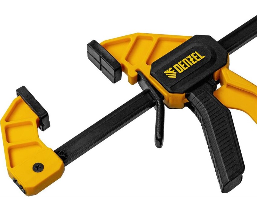 Струбцина F-образная быстрозажимная Denzel 20502 с пошаговым зажимом шириной 300 мм и глубиной 55 мм, с усиленным нейлоновым корпусом, позволяет прочно зафиксировать детали для их обработки, склеивания и выполнения других задач. Сила сжатия составляет 680 Н. Струбцина подходит для бытового и профессионального применения.ПреимуществаУсиленная конструкция — нейлоновый корпус устойчив к ударным нагрузкам и падениям с небольшой высоты.Увеличенная жесткость и прочность — направляющая выполнена из двутаврового стального профиля и закалена.Аккуратная работа с любыми материалами — съемные мягкие губки позволяют зафиксировать деталь без риска повреждения и деформации.Расширенный функционал — переставные губки позволяют использовать струбцину на разжим.Комфортное использование — струбцина весит всего 360 г, обрезиненная кнопка фиксации обеспечивает удобный захват.