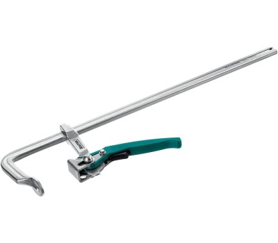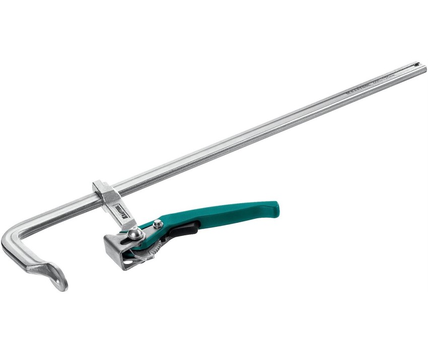 Профессиональный быстрозажимной инструмент , Цельнокованная мегапрочная направляющая рейка. Надежный храповый механизм с эксцентриковым зажимом. Сила сжатия 500 кг. Жесткая конструкция рамы. Сохраняет силу зажима даже при воздействии вибрации. Подходит для применения в машинной среде. Возможна работа одной рукой. Продуманная система снятия зажима даже при экстримальном сжатии. Для профессионального использования. Преимущества Рычажный механизм: быстрый, мощный зажим Сила сжатия 500 кг. Кнопка быстрого сброса сжатия Работа при экстремальных температурах Специальная конструкция плавающей полированной губки не сдвигает и не повреждает заготовки Большой ход рычажного механизма Использование Применяется для фиксации и удержания деталей при выполнении столярных и сле-сарных работ.