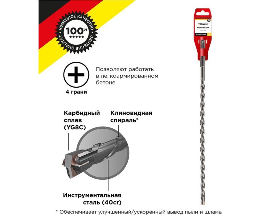 Бур по бетону с крестообразным наконечником 10x310 мм KRANZ используется во время строительных и ремонтных работ. Предназначен для сверления и бурения отверстий в слабоармированном бетоне, граните, кирпичной кладке и камне при помощи перфоратора с креплением SDS PLUS, которое используется в большинстве электроинструментов бытового и профессионального назначения. Изделие выполнено из качественной стали, что обеспечивает долгий ресурс работы и высокую производительность. Конструкция со стабилизирующей спиралью сохраняет точное положение бура во время сверления и равномерно распределяет ударную нагрузку, кромки с 4 гранями обеспечивают легкое выведение шлама и мелких частиц пыли из рабочей зоны, что поддерживает скорость работы, а усиленный резец предотвращает заклинивание оснастки в арматуре. Твердосплавная вставка на конце бура способствует эффективному входу в материал, что увеличивает цикл службы оснастки и уменьшает износ сверла.
