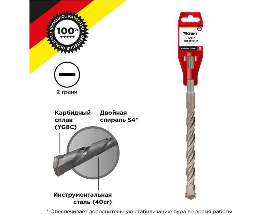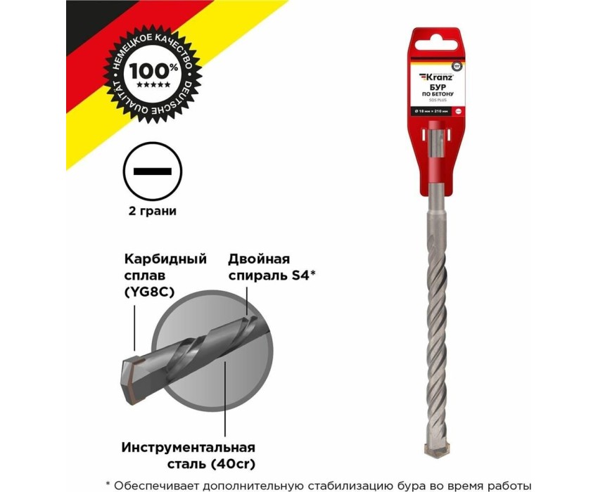 Бур по бетону с цилиндрическим хвостовиком 18x210 мм KRANZ используется во время строительных и ремонтных работ. Предназначен для сверления и бурения отверстий в слабоармированном бетоне, граните, кирпичной кладке и камне при помощи перфоратора с креплением SDS PLUS, которое используется в большинстве электроинструментов бытового и профессионального назначения. Изделие выполнено из качественной стали, что обеспечивает долгий ресурс работы и высокую производительность. Конструкция со стабилизирующей спиралью сохраняет точное положение бура во время сверления и равномерно распределяет ударную нагрузку, кромки с 2 гранями обеспечивают легкое выведение шлама и мелких частиц пыли из рабочей зоны, что поддерживает скорость работы, а усиленный резец предотвращает заклинивание оснастки в арматуре. Твердосплавная вставка на конце бура способствует эффективному входу в материал, что увеличивает цикл службы оснастки и уменьшает износ сверла.