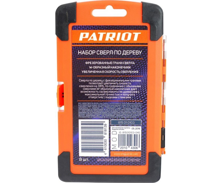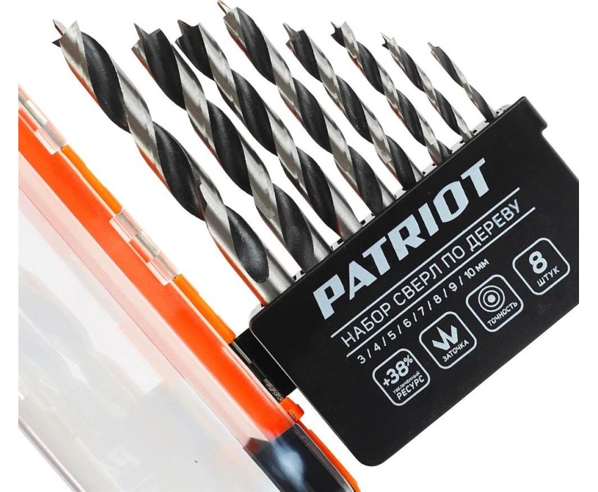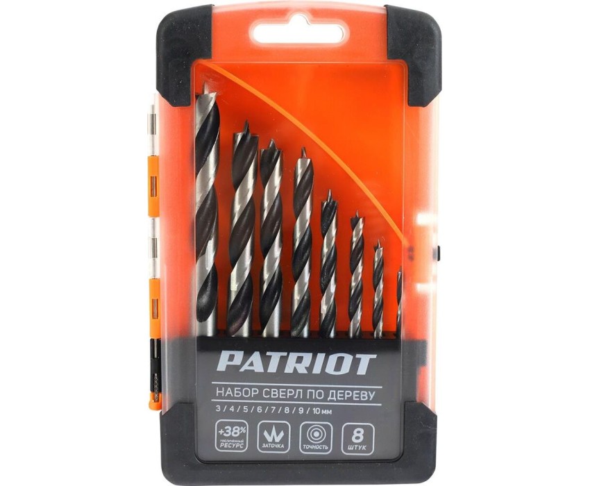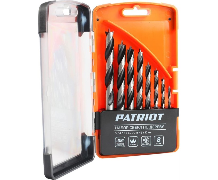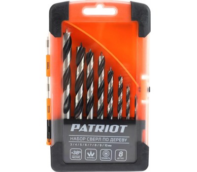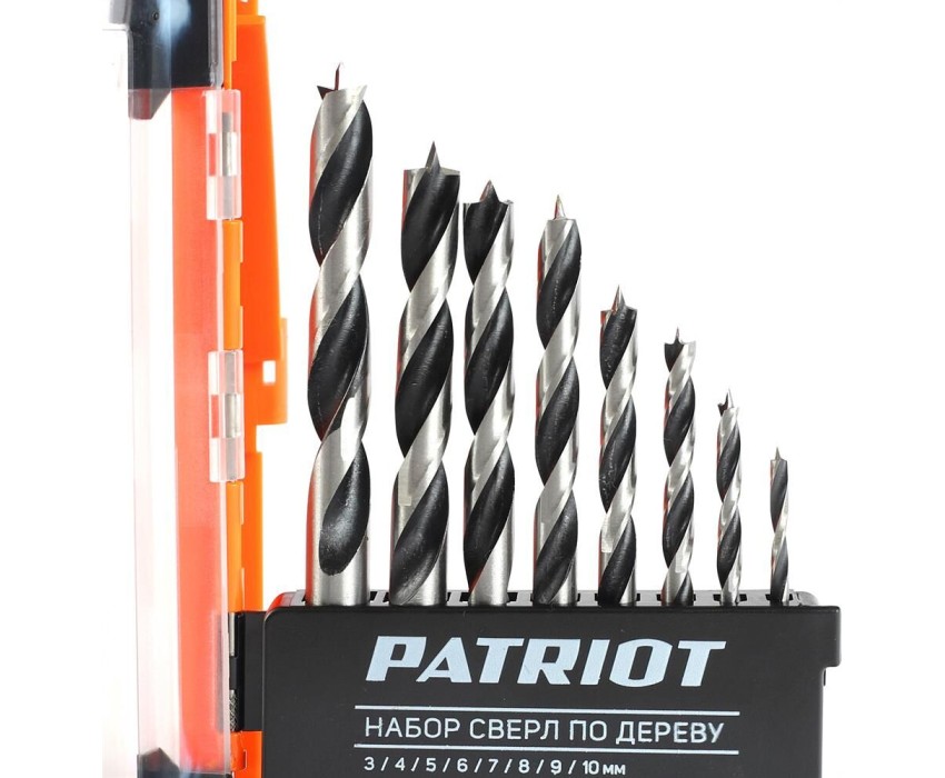 Набор сверел PATRIOT 815010103 по дереву спиральные W-образная заточка 3, 4, 5, 6, 7, 8, 9, 10 мм Набор сверел