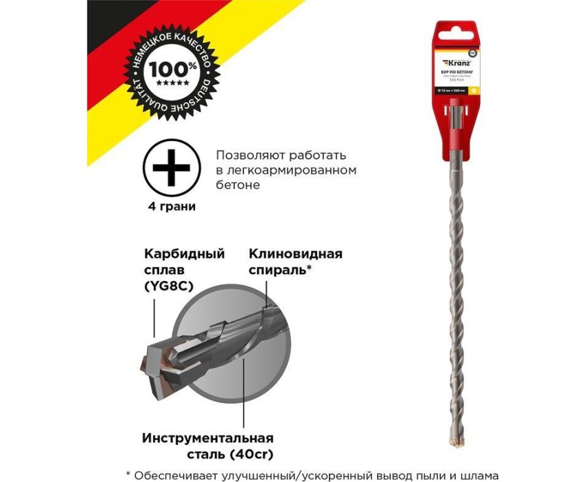 Бур по бетону с крестообразным наконечником KRANZ предназначен для сверления и бурения отверстий в слабоармированном бетоне, граните, кирпичной кладке и камне. Используется при проведении строительных и ремонтных работ. Бур применяется совместно с перфораторами, оснащенными креплением SDS PLUS, которое является стандартным для большинства электроинструментов. Благодаря конструкции со стабилизирующей спиралью, бур сохраняет точное положение в процессе сверления и обеспечивает равномерное распределение ударной нагрузки. Крестовая вставка из карбидного сплава (YG8C) с 4 гранями, расположенная на конце бура, способствует эффективному и быстрому входу в материал, что увеличивает долговечность бура и снижет вероятность его поломки при попадании в арматуру. Материал изготовления тела бура – инструментальная легированная сталь (40cr).