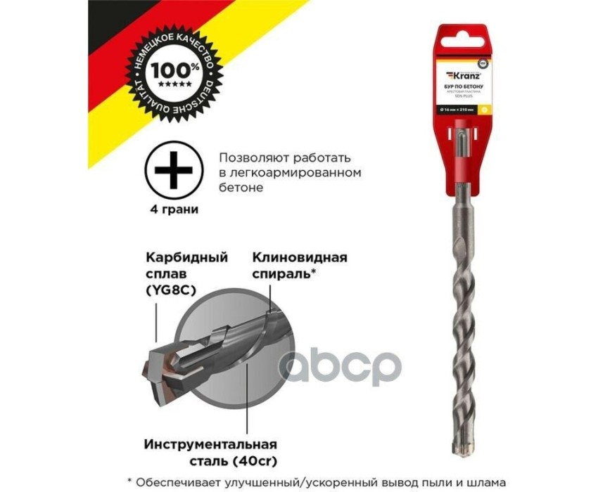 Бур по бетону с крестообразным наконечником KRANZ предназначен для сверления и бурения отверстий в слабоармированном бетоне, граните, кирпичной кладке и камне. Используется при проведении строительных и ремонтных работ. Бур применяется совместно с перфораторами, оснащенными креплением SDS PLUS, которое является стандартным для большинства электроинструментов. Благодаря конструкции со стабилизирующей спиралью, бур сохраняет точное положение в процессе сверления и обеспечивает равномерное распределение ударной нагрузки. Крестовая вставка из карбидного сплава (YG8C) с 4 гранями, расположенная на конце бура, способствует эффективному и быстрому входу в материал, что увеличивает долговечность бура и снижет вероятность его поломки при попадании в арматуру. Материал изготовления тела бура – инструментальная легированная сталь (40cr).