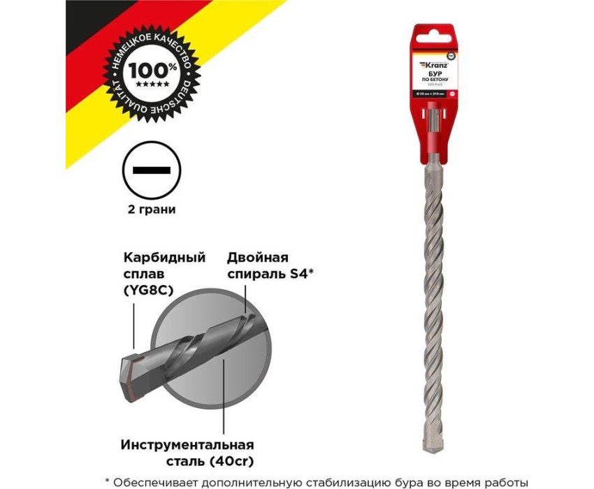 Бур с хвостовиком SDS PLUS KRANZ используется во время строительных и ремонтных работ. Предназначен для сверления и бурения отверстий в граните, бетоне, кирпичной кладке и камне при помощи перфоратора с креплением SDS PLUS, которое применяется в большинстве электроинструментов бытового и профессионального назначения. Изделие выполнено из инструментальной стали, обеспечивающей долгий ресурс работы и высокую производительность. Конструкция со стабилизирующей спиралью сохраняет точное положение бура во время сверления и равномерно распределяет ударную нагрузку. На режущей пластине имеется центрирующая головка – во время работы бур не уводит в сторону, что повышает качество сверления и продлевает ресурс работы инструмента. Твердосплавная вставка на конце бура, изготовленная из карбидного сплава (YG8C), обеспечивает эффективный вход в материал, продлевая цикл службы оснастки и уменьшая износ.