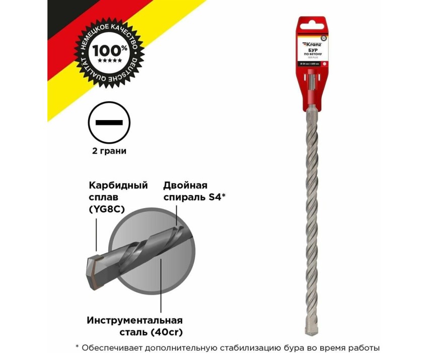 Бур с хвостовиком SDS PLUS KRANZ используется во время строительных и ремонтных работ. Предназначен для сверления и бурения отверстий в граните, бетоне, кирпичной кладке и камне при помощи перфоратора с креплением SDS PLUS, которое применяется в большинстве электроинструментов бытового и профессионального назначения. Изделие выполнено из инструментальной стали, обеспечивающей долгий ресурс работы и высокую производительность. Конструкция со стабилизирующей спиралью сохраняет точное положение бура во время сверления и равномерно распределяет ударную нагрузку. На режущей пластине имеется центрирующая головка – во время работы бур не уводит в сторону, что повышает качество сверления и продлевает ресурс работы инструмента. Твердосплавная вставка на конце бура, изготовленная из карбидного сплава (YG8C), обеспечивает эффективный вход в материал, продлевая цикл службы оснастки и уменьшая износ.
