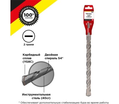 Бур с хвостовиком SDS PLUS KRANZ используется во время строительных и ремонтных работ. Предназначен для сверления и бурения отверстий в граните, бетоне, кирпичной кладке и камне при помощи перфоратора с креплением SDS PLUS, которое применяется в большинстве электроинструментов бытового и профессионального назначения. Изделие выполнено из инструментальной стали, обеспечивающей долгий ресурс работы и высокую производительность. Конструкция со стабилизирующей спиралью сохраняет точное положение бура во время сверления и равномерно распределяет ударную нагрузку. На режущей пластине имеется центрирующая головка – во время работы бур не уводит в сторону, что повышает качество сверления и продлевает ресурс работы инструмента. Твердосплавная вставка на конце бура, изготовленная из карбидного сплава (YG8C), обеспечивает эффективный вход в материал, продлевая цикл службы оснастки и уменьшая износ.