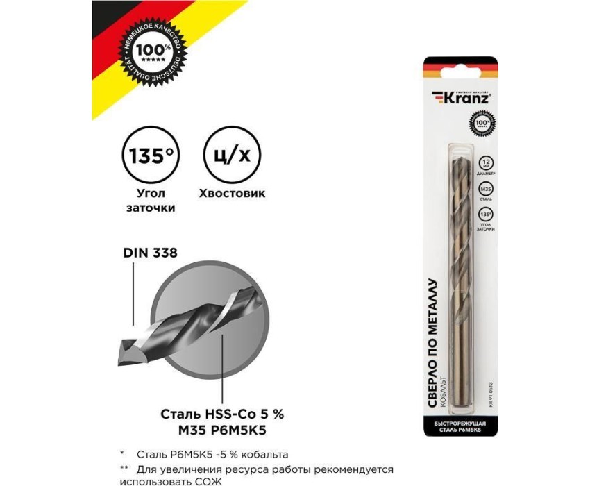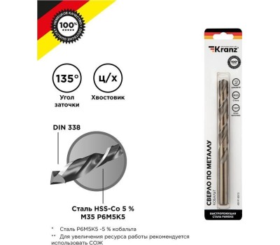 Сверло KRANZ (KR-91-0513) Сверло по металлу 12х151х101мм Кобальт (сталь HSS-Co 5 % M35 P6M5K5) DIN 338, 1 шт. в блистере