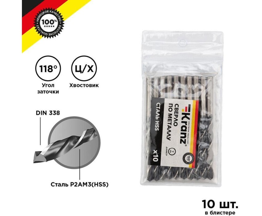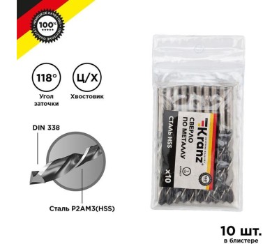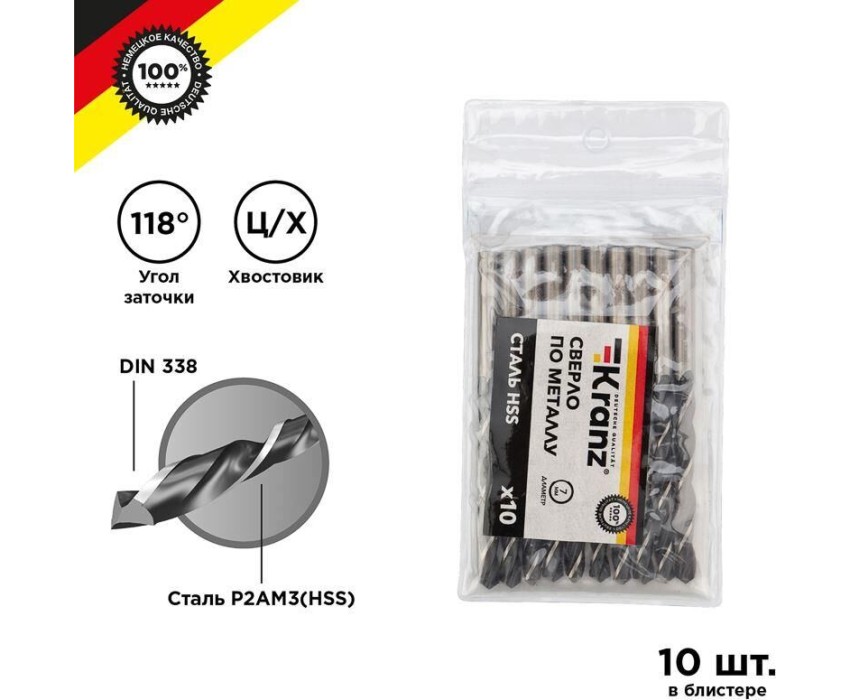 Сверло KRANZ (KR-91-0623) Сверло по металлу 7,0х109х69мм (HSS), DIN 338, 10 шт. в упаковке