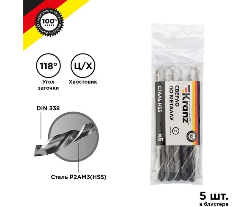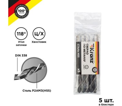 Сверло KRANZ (KR-91-0627) Сверло по металлу 9,0х125х81мм (HSS), DIN 338, 5 шт. в упаковке