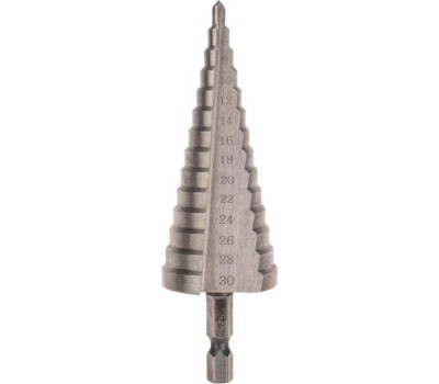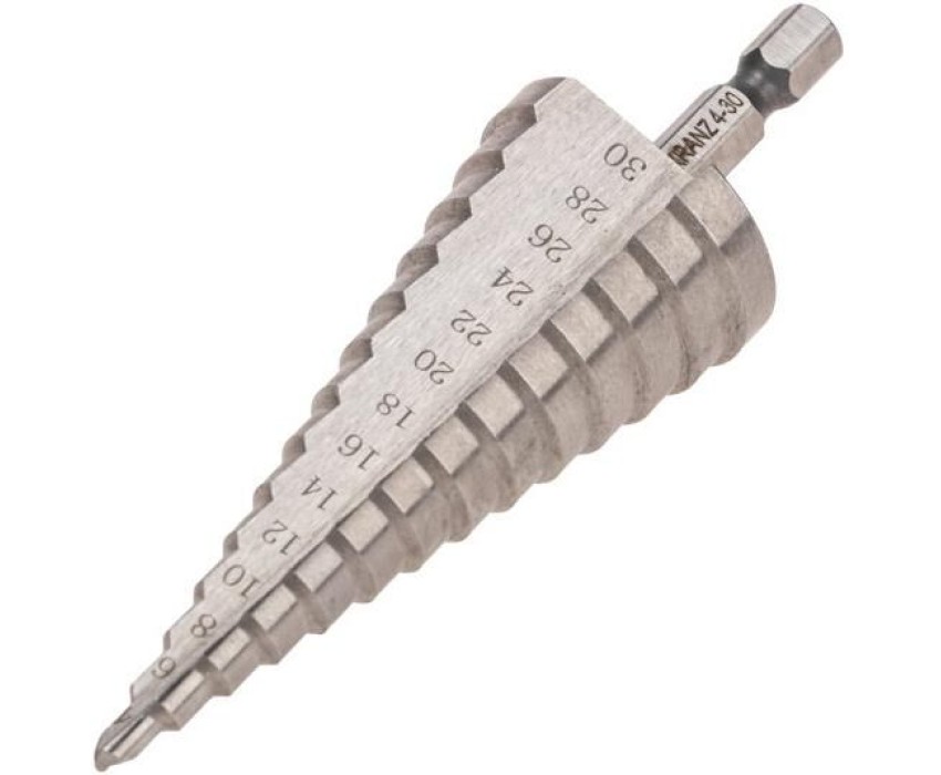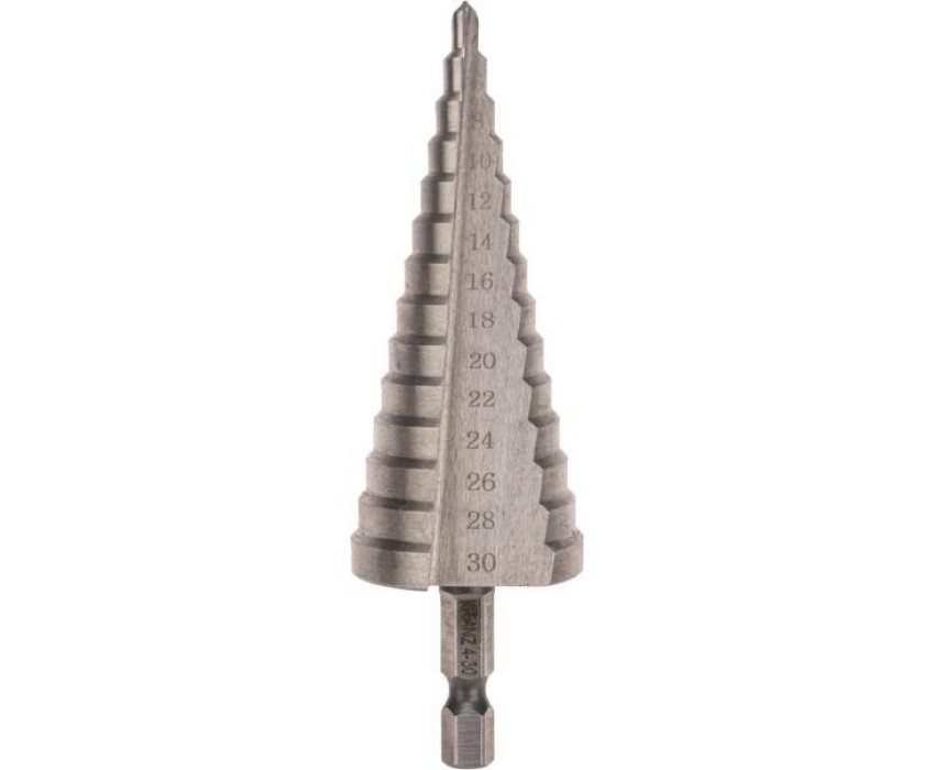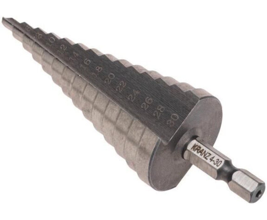 Ступенчатое сверло KRANZ применяется при выполнении монтажно-сборочных работ для сверления отверстий различных диаметров без перестановки режущего инструмента. Применяется в работе с такими материалами, как пластик, дерево, металл и др. Благодаря своей уникальной конструкции изделие заменяет целый набор традиционных спиральных сверл. Использование оснастки позволяет сэкономить время мастера, так как не требует предварительного кернения и сверления. Шестигранный хвостовик Е6,3 обеспечивает надежную фиксацию сверла во всех типах патронов шуруповертов и дрелей. Форма канавки – прямая. На каждой из 14 ступеней сверла нанесена маркировка фактического диаметра. Диапазон ступеней: 4, 6, 8, 10, 12, 14, 16, 18, 20, 22, 24, 26, 28, 30 (шаг 2 мм). Сверло изготовлено из быстрорежущей инструментальной стали (HSS) и обладает высокой прочностью, а также устойчивостью к динамическим нагрузкам и перегреву.