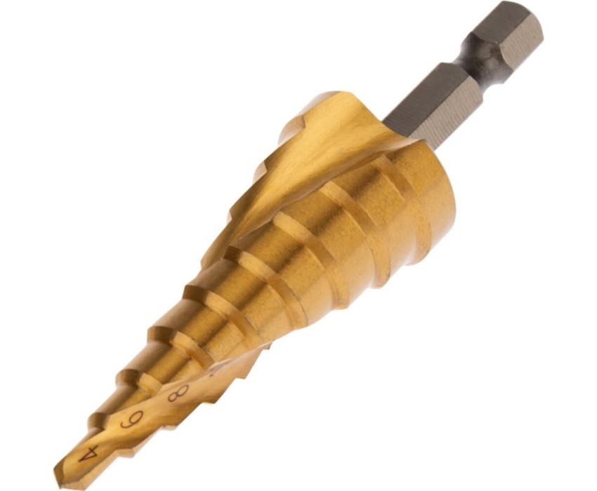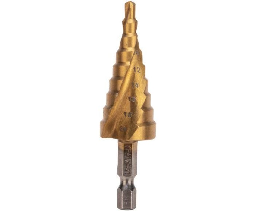 Ступенчатое сверло KRANZ предназначено для сверления отверстий различных диаметров одним сверлом в материалах толщиной до 5 мм (сталь, цветные металлы, нержавейка, пластик, дерево). На каждую ступень сверла нанесена маркировка фактического диаметра. Изделие оснащено трехгранным хвостовиком, что предотвращает проворачивание в зажимных патронах. Сверло изготовлено из высококачественной быстрорежущей стали Р6М5, которая обеспечивает надежность, стабильное качество работы, долгий ресурс и высокую производительность. Сверление металла становится более легким благодаря спиральной форме профиля. Покрытие из нитрид-титана предотвращает преждевременный износ инструмента и образование коррозии. Обладает высокой прочностью и повышенной точностью в отличие от обычных сверл данного типа.