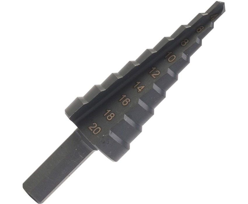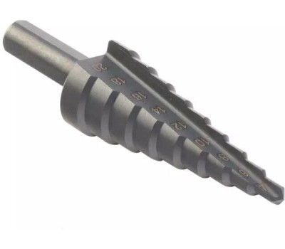 Сверло по металлу ступенчатое 4-20 мм PATRIOT 815010702 - для сверления отверстий в профильных и листовых материалах из стали, цветных мелаллов и пластика толщиной до 5 мм. Благодаря плавному ступенчатому переходу и возможности сразу снять фаску отверстие получается аккуратным и имеет ровные края. Трехгранный хвостовик предотвращает проскальзывание сверла в патроне. Характеристики: Диаметр отверстия - 9 ступеней, 4-20 мм. Шаг - 2 мм. Для инструмента - дрель, дрель-шуруповерт. Тип сверла - ступенчатое.