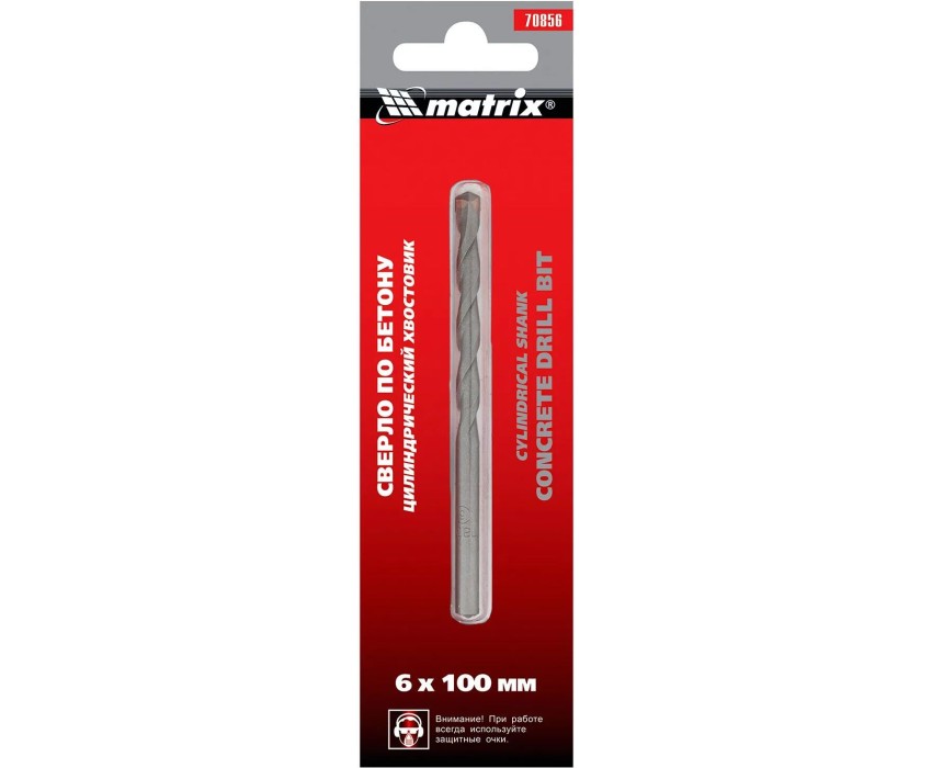 Сверло Matrix 70856 размером 6 х 100 мм, с цилиндрическим хвостовиком, устанавливается на дрель и используется для получения отверстий в бетоне, кирпиче, мраморе и других твердых материалах.