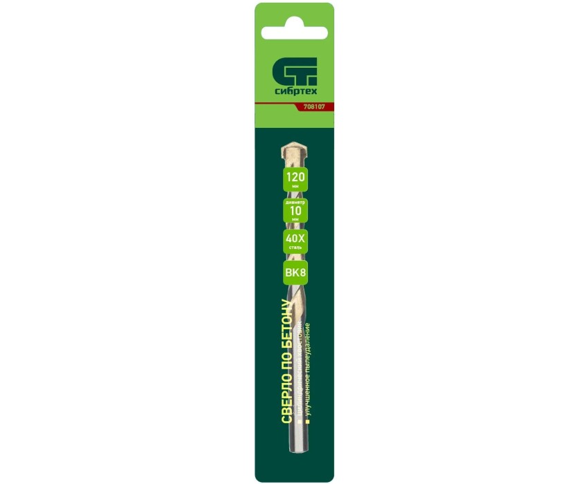 Сверло по бетону Сибртех 708107 диаметром 10 мм и длиной 120 мм, с цилиндрическим хвостовиком и улучшенным пылеудалением, предназначено для сверления в ударном режиме бетона и кирпича.