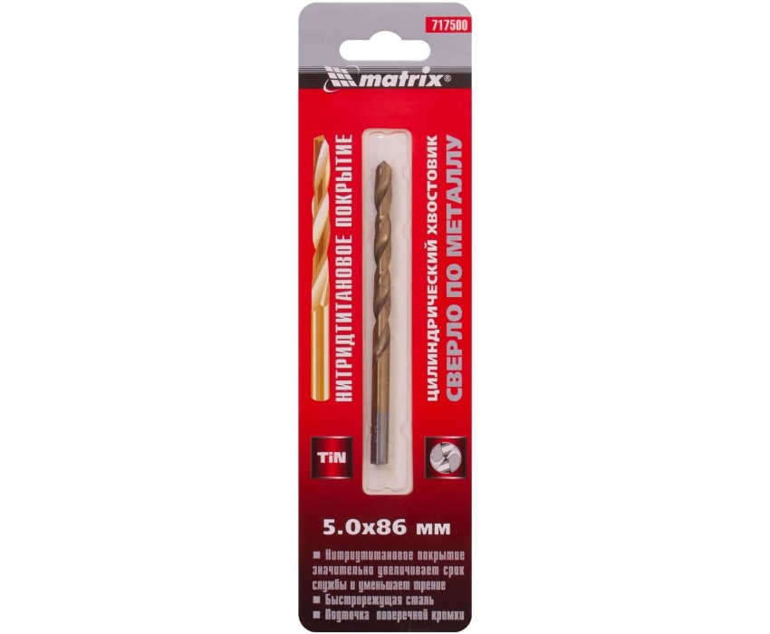 Сверло Matrix 717500 диаметром 5 мм, из стали HSS, с нитридтитановым покрытием и цилиндрическим хвостовиком, предназначено для получения отверстий в металле. Угол заточки 118° оптимален для работы с черными металлами, сталью, чугуном и твердой бронзой.