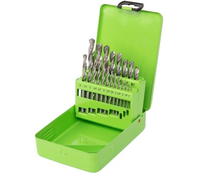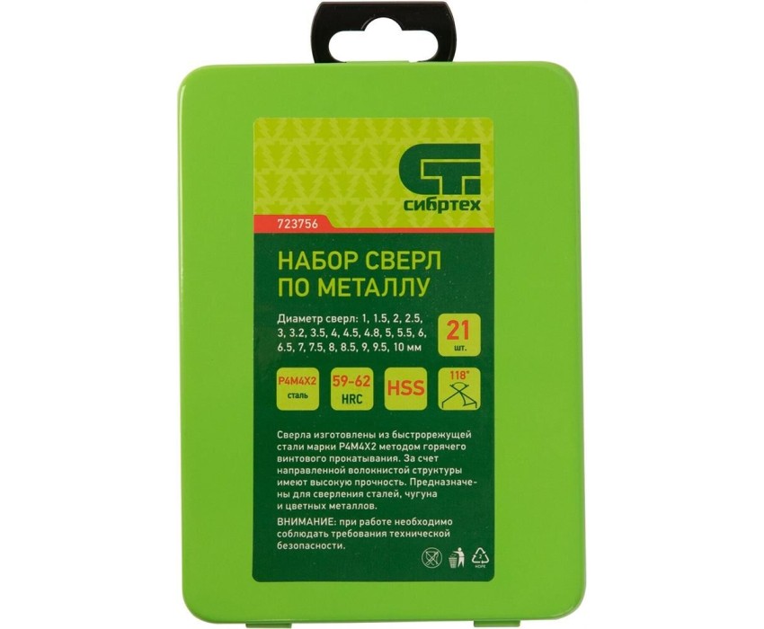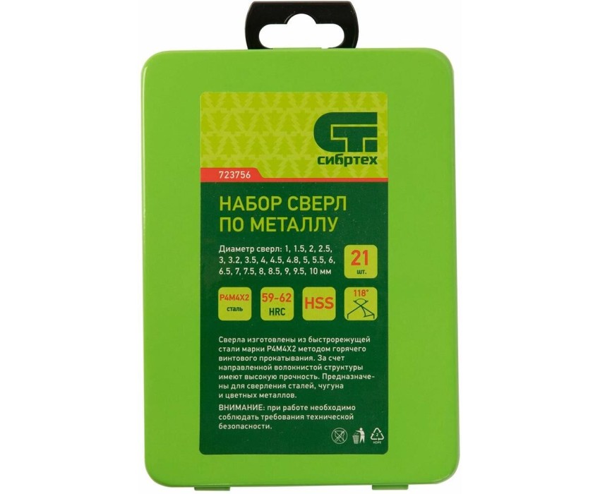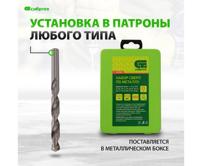 Набор сверл по металлу Сибртех 723756 диаметром 1-10 мм (через 0,5 мм, 3,2, 4,8 мм), из стали HSS, с цилиндрическим хвостовиком, состоит из 21 шт. и упакован в металлический бокс. Используется для получения отверстий в черных металлах, в том числе стали и чугуне. Большой выбор оснасток позволяет точно подобрать необходимый размер. Набор поставляется в надежном металлическом боксе и пригодится во время строительства и ремонта, а также будет полезен для бытовых работ.ПреимуществаПрочность — сверла изготовлены из быстрорежущей стали, устойчивой к механическому воздействию и перегреву.Высокий ресурс работоспособности — режущие кромки твердостью 59-62 HRC долго держат заточку.Универсальность — сверла с цилиндрическими хвостовиками совместимы со всеми типами патронов.Улучшенный отвод стружки — поверхность оснасток отполирована, что уменьшает их трение о стенки отверстий.Защита от заклинивания — диаметр направляющей части сверл уменьшается по направлению к хвостовику.Быстрый выбор оснастки — сверла помещены в гнезда с обозначениями размеров.