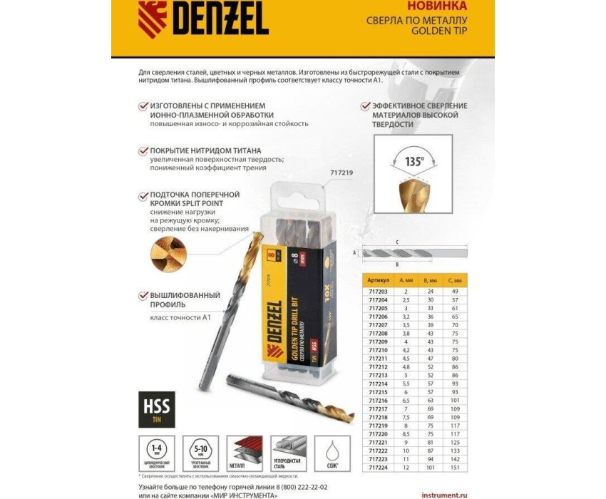 Сверло по металлу Denzel Golden Tip 717224 диаметром 12 мм, из стали HSS-TIn, 6 шт. в упаковке, используется для получения отверстий в стальных заготовках. Оснастка вышлифована на современном оборудовании и имеет класс точности A1, что позволяет получить отверстия высокого качества. Набор применяется во время слесарных работ.ПреимуществаПрочность — сверла из быстрорежущей стали устойчивы к перегреву и выдерживают высокие нагрузки.Долговечность — оснастка изготовлена с применением технологии азотирования и имеет нитридтитановое покрытие, что обеспечивает устойчивость к истиранию и образованию коррозии.Высокая скорость сверления — каждое сверло обладает пониженным коэффициентом трения и обеспечивает эффективный отвод стружки.Легкое засверливание — подточка поперечной кромки Split point позволяет приступать к работе без предварительной разметки поверхности (накернивания).Удобное хранение и транспортировка — сверла поставляются в прочном пластиковом боксе.