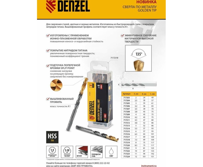 Сверло по металлу Denzel Golden Tip 717206 диаметром 3,2 мм, из стали HSS-TIn, 10 шт. в упаковке, используется для получения отверстий в стальных заготовках. Оснастка вышлифована на современном оборудовании и имеет класс точности A1, что позволяет получить отверстия высокого качества. Набор применяется во время слесарных работ.ПреимуществаПрочность — сверла из быстрорежущей стали устойчивы к перегреву и выдерживают высокие нагрузки.Долговечность — оснастка изготовлена с применением технологии азотирования и имеет нитридтитановое покрытие, что обеспечивает устойчивость к истиранию и образованию коррозии.Высокая скорость сверления — каждое сверло обладает пониженным коэффициентом трения и обеспечивает эффективный отвод стружки.Легкое засверливание — подточка поперечной кромки Split point позволяет приступать к работе без предварительной разметки поверхности (накернивания).Удобное хранение и транспортировка — сверла поставляются в прочном пластиковом боксе.