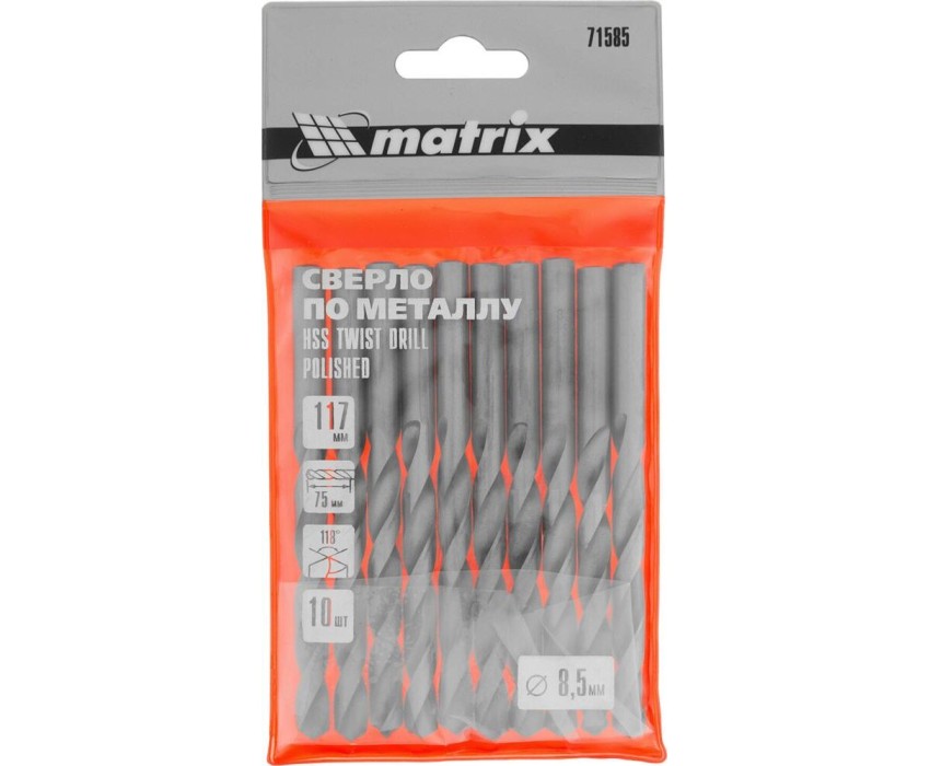 Сверло MATRIX Сверло по металлу, 8.5 мм, полированное, HSS, 10 шт, цилиндрический хвостовик 71585