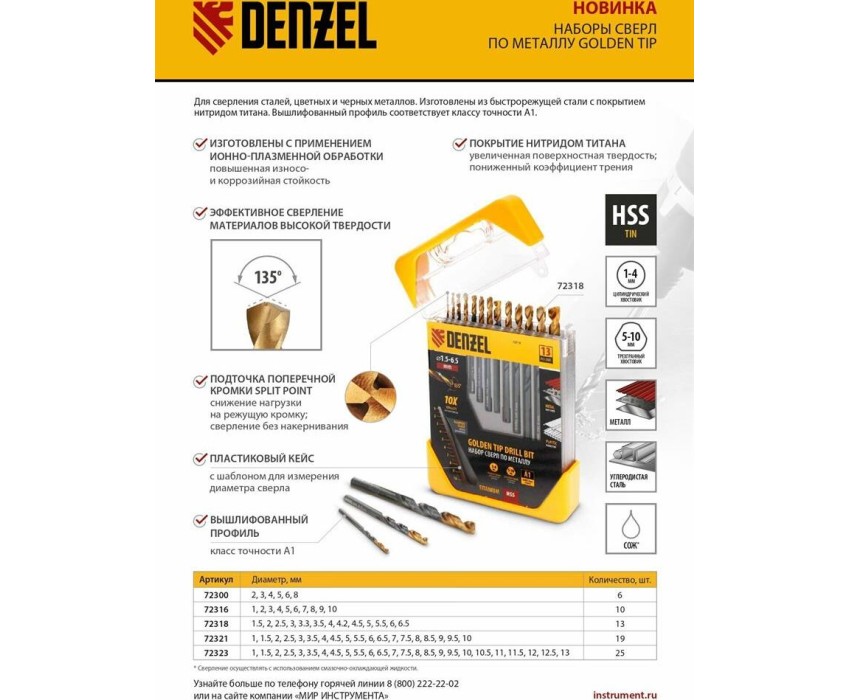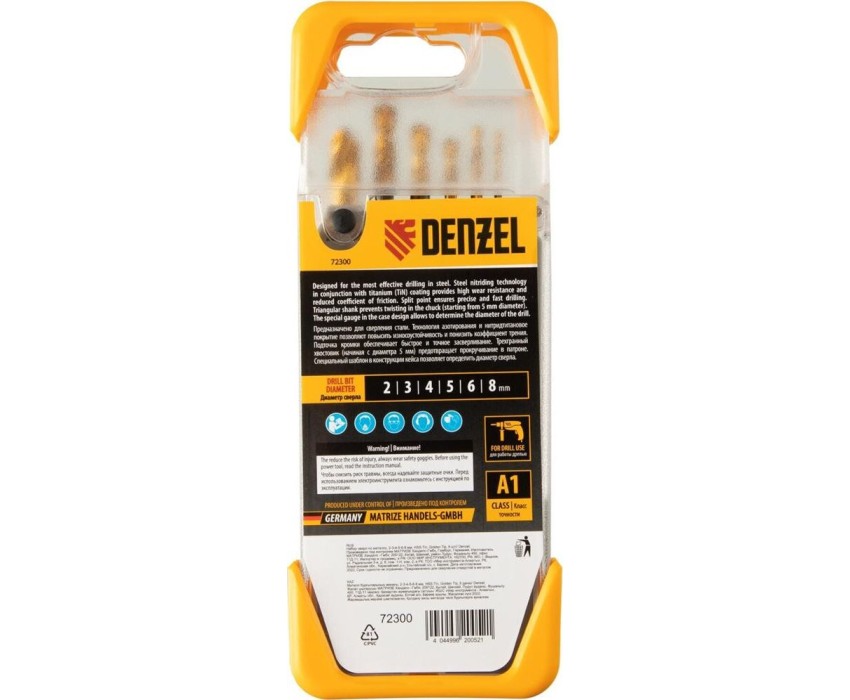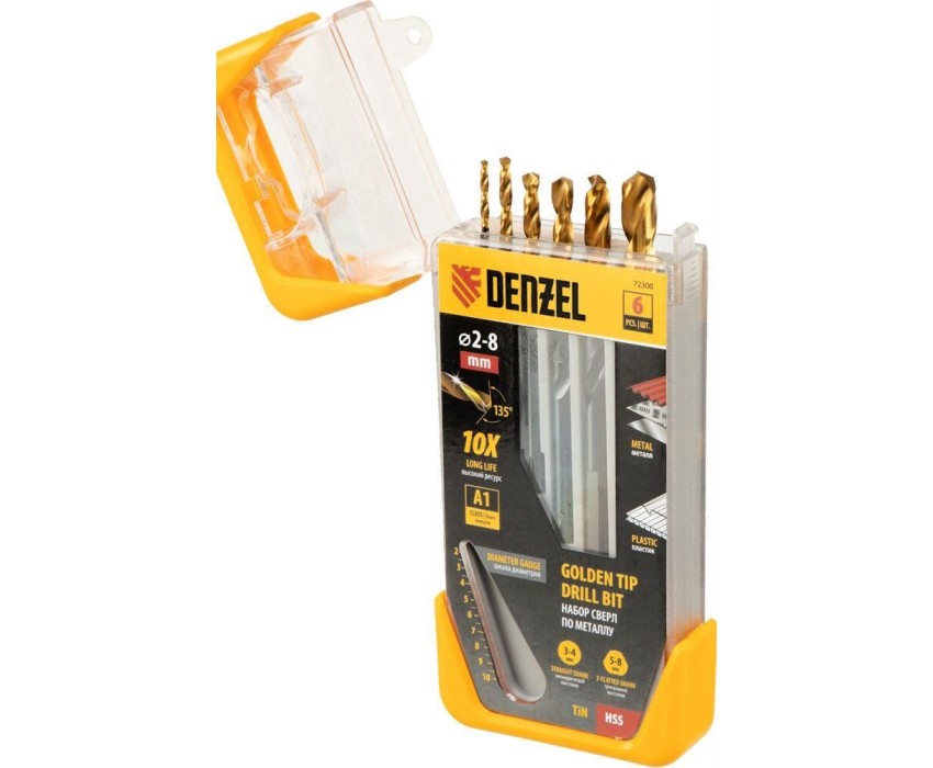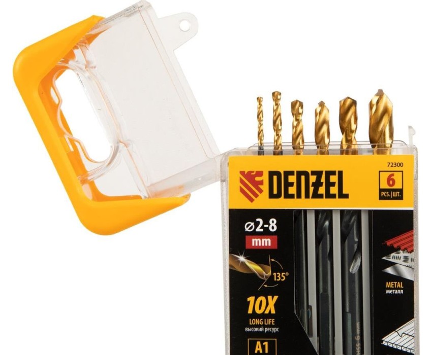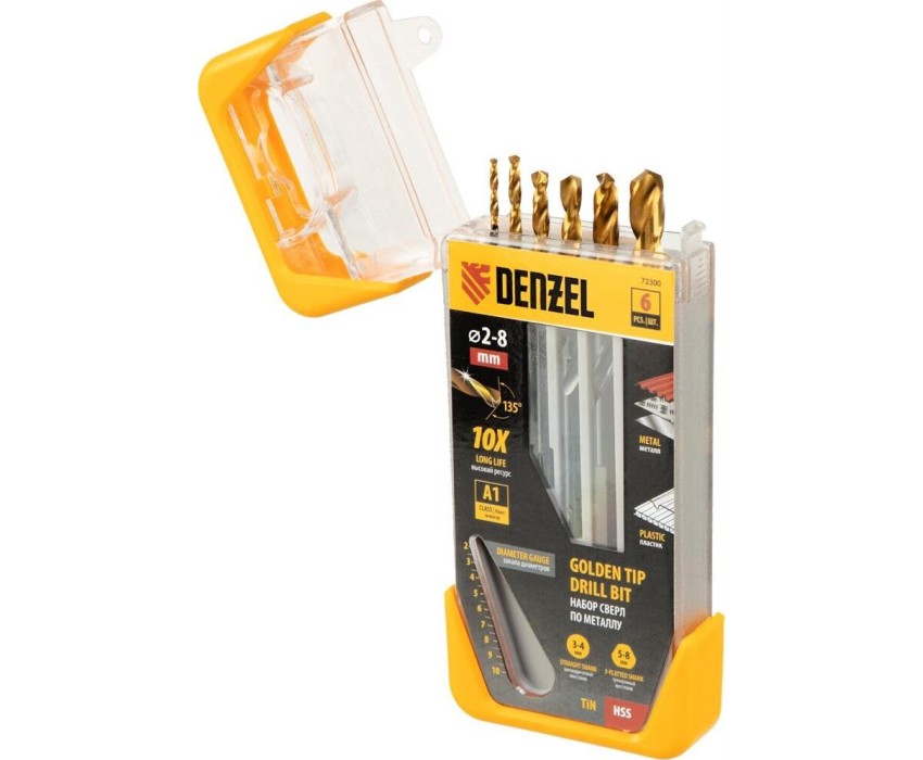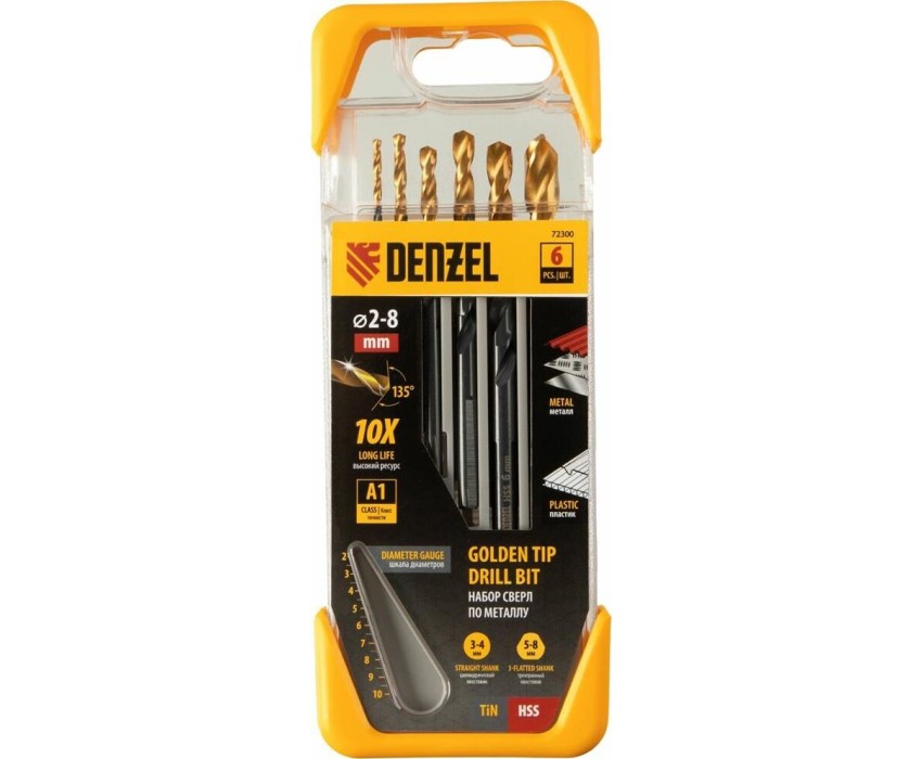 Набор Denzel Golden Tip 72300 включает 6 сверл по металлу диаметром 2, 3, 4, 5, 6 и 8 мм, предназначенных для сверления отверстий в заготовках из сталей различной твердости. Оснастке присвоен класс точности A1: оптимальная геометрия вышлифованных профилей обеспечивает высокую точность полученных отверстий. Сверла упакованы в пластиковый кейс, в крышке которого имеется удобный шаблон для быстрого определения диаметра. Набор будет полезен дома и в слесарной мастерской.Преимущества Прочность — сверла из быстрорежущей стали устойчивы к перегреву и выдерживают высокие нагрузки. Долговечность — оснастки изготовлены с применением технологии азотирования и имеют нитридтитановое покрытие, что обеспечивает устойчивость к истиранию и образованию коррозии. Высокая скорость сверления — сверла обладают пониженным коэффициентом трения и обеспечивают эффективный отвод стружки. Легкое засверливание — подточка поперечной кромки Split point позволяет приступать к работе без предварительной разметки поверхности (накернивания). Надежная фиксация — сверла с трехгранными хвостовиками не проворачиваются в патроне. Удобное хранение и транспортировка — сверла поставляются в прочном пластиковом кейсе.