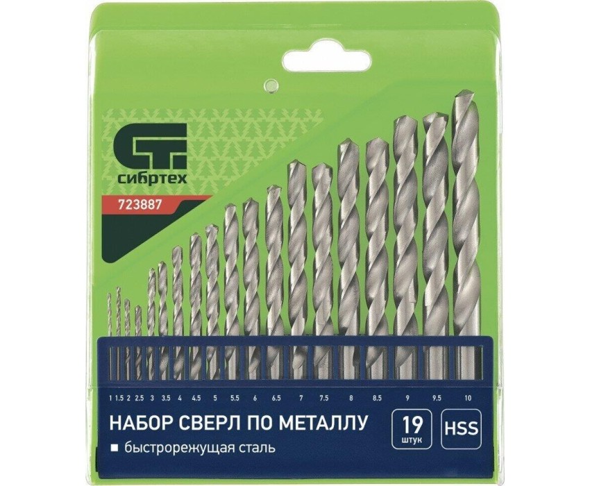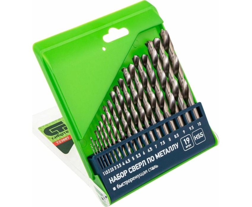 Набор сверл по металлу Сибртех 723887 диаметром 1-10 мм (через 0,5 мм), из стали HSS, с цилиндрическим хвостовиком, состоит из 19 шт. и упакован в пластиковую коробку. Используется для получения отверстий в черных металлах, в том числе стали и чугуне. Большой выбор оснасток позволяет точно подобрать необходимый размер. Набор поставляется в надежном пластиковом боксе и пригодится во время строительства и ремонта, а также будет полезен для бытовых работ.ПреимуществаПрочность — сверла изготовлены из быстрорежущей стали, устойчивой к механическому воздействию и перегреву.Высокий ресурс работоспособности — режущие кромки твердостью 62-64 HRC долго держат заточку.Универсальность — сверла с цилиндрическими хвостовиками совместимы со всеми типами патронов.Улучшенный отвод стружки — поверхность оснасток отполирована, что уменьшает их трение о стенки отверстий.Защита от заклинивания — диаметр направляющей части сверл уменьшается по направлению к хвостовику.Быстрый выбор оснастки — сверла помещены в гнезда с обозначениями размеров.