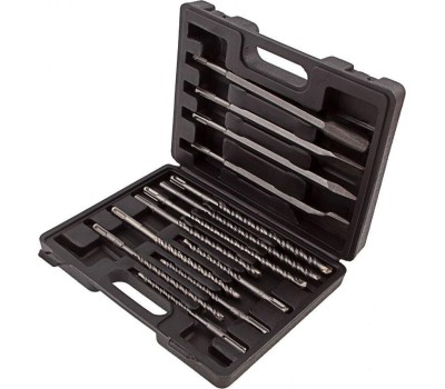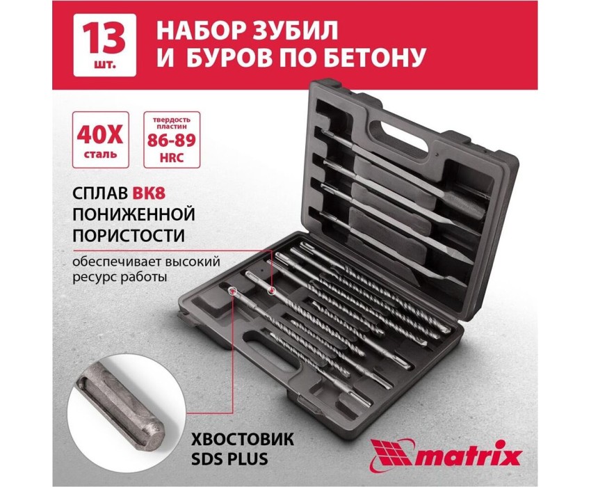 Набор Matrix 71098, упакованный в бокс, включает 9 буров по бетону размером 6-8-10 х 160 мм, 8-10-12 х 210 мм, 10-12-14 х 260 мм и 4 зубила, которые используются в качестве оснастки на перфораторах с патронами SDS PLUS. Набор предназначен для сверления отверстий в бетоне, кирпиче и камне, а также для удаления старого слоя штукатурки, снятия облицовочной плитки, штробления и демонтажа армированного бетона. Подходит для работы на строительной площадке, пригодится ремонтным бригадам и профессиональным мастерам, также будет полезен в быту.ПреимуществаВысокий ресурс — твердосплавные рабочие пластины буров выполнены из стали ВК8 твердостью 80-90 HRC, а кромки зубил самозатачиваются во время работы.Прочность — рабочие части буров и зубил выдерживают интенсивные ударные нагрузки, т.к. изготовлены из закаленной легированной стали 40Х с добавлением хрома.Повышенная производительность — режущие поверхности зубил с оптимально подобранными углами заточки увеличивают эффективность работ.Эффективный отвод шлама — двойная усиленная спираль буров ускоряет удаление пыли в процессе сверления, что позволяет уменьшить нагрузку на перфоратор.Удобное хранение и транспортировка — набор упакован в прочный пластиковый кейс.