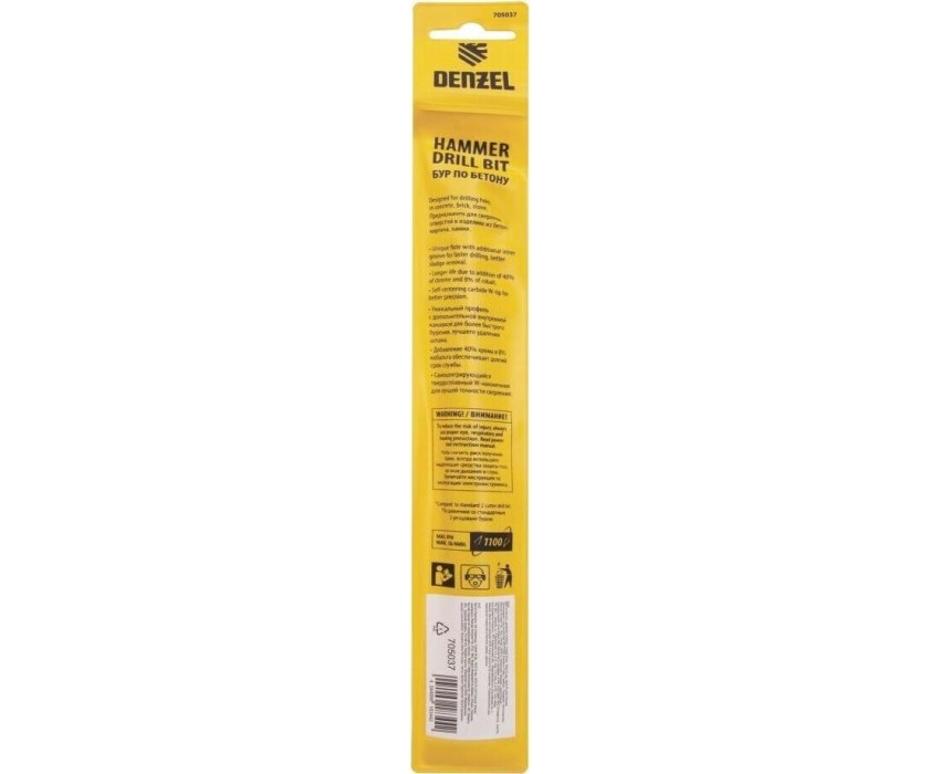 Бур по бетону Denzel арт. 705037 с хвостовиком SDS PLUS и двойной спиралью предназначен для сверления отверстий в бетоне, кирпиче и камне. Он используется в качестве оснастки для перфораторов с патроном SDS Plus. Бур оптимален для проведения строительных, ремонтных, монтажных работ.ПреимуществаВысокий ресурс — режущая твердосплавная пластина из стали ВК8 твердостью 80-90 HRC с W-образной заточкой способна сверлить отверстия до 30% быстрее, в том числе при работе с камнем.Прочность и износостойкость — рабочая часть из легированной стали 40Х выдерживает интенсивные и длительные ударные нагрузки, а также делает бур самым высокопроизводительным среди аналогов средней цены.Двойная спираль и канавка с дополнительным желобом — за счет более эффективного отвода шлама рабочая часть не перегревается, что позволяет продлить срок службы бура.Удобная упаковка с европодвесом — оснастку можно разместить на стенде.