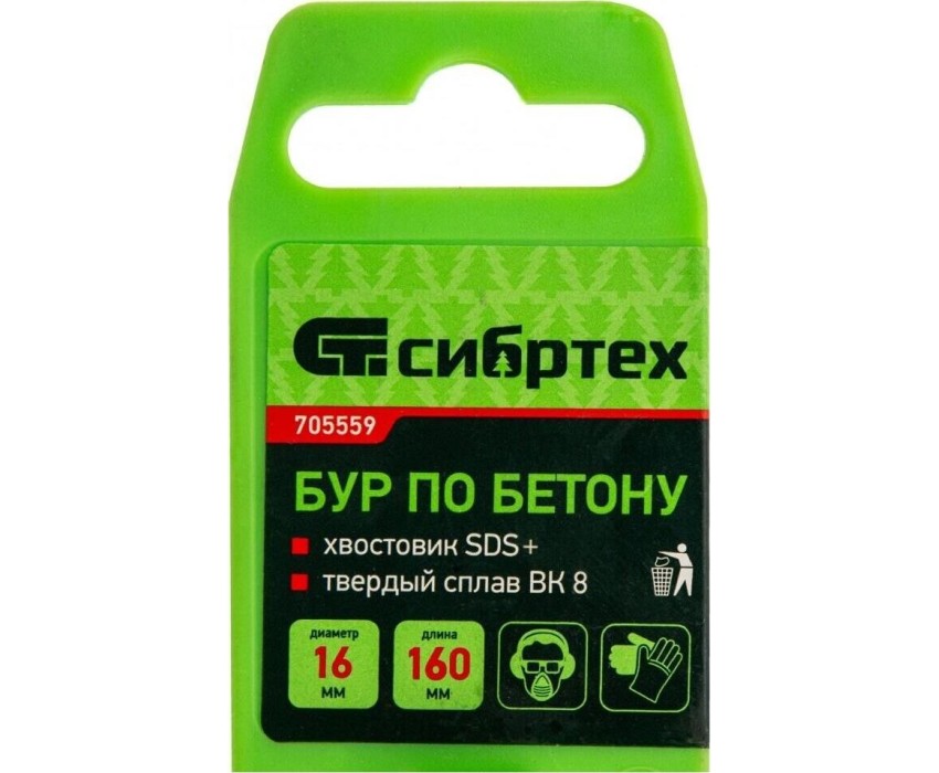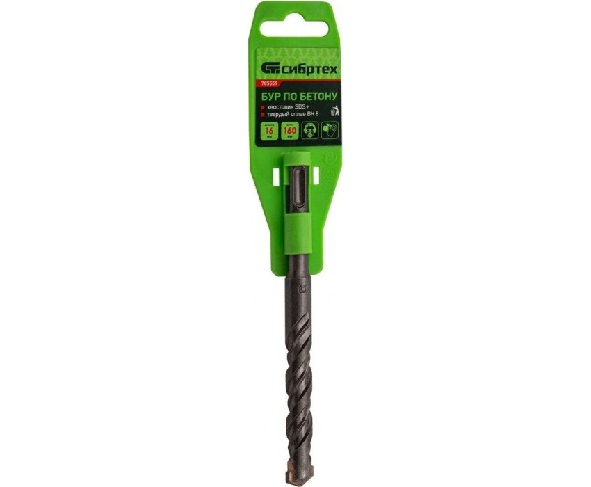 Бур по бетону Сибртех 705559 размером 16 х 160 мм предназначен для перфораторов с хвостовиком типа SDS Plus. Способен сверлить отверстия в материалах из бетона и кирпича, а также в искусственном и природном камне. Бур отлично подойдет для домашнего использования со средним объемом работ.ПреимуществаПрочность и износостойкость — режущая пластина пониженной пористости изготовлена из высококачественной стали ВК8 и закалена до твердости 87-90 HRC.Долговечность — корпус выполнен из легированной стали 40Х и термообработан — это обеспечивает одинаковую твердость всей спиральной части бура, благодаря чему он способен выдерживать динамические нагрузки.Защитное покрытие — бур не подвержен образованию коррозии, а значит, он дольше прослужит мастеру.Выгода приобретения — буры Сибртех отличаются не только оптимальным соотношением цены и качества, но и высоким ресурсом по сравнению с аналогами.