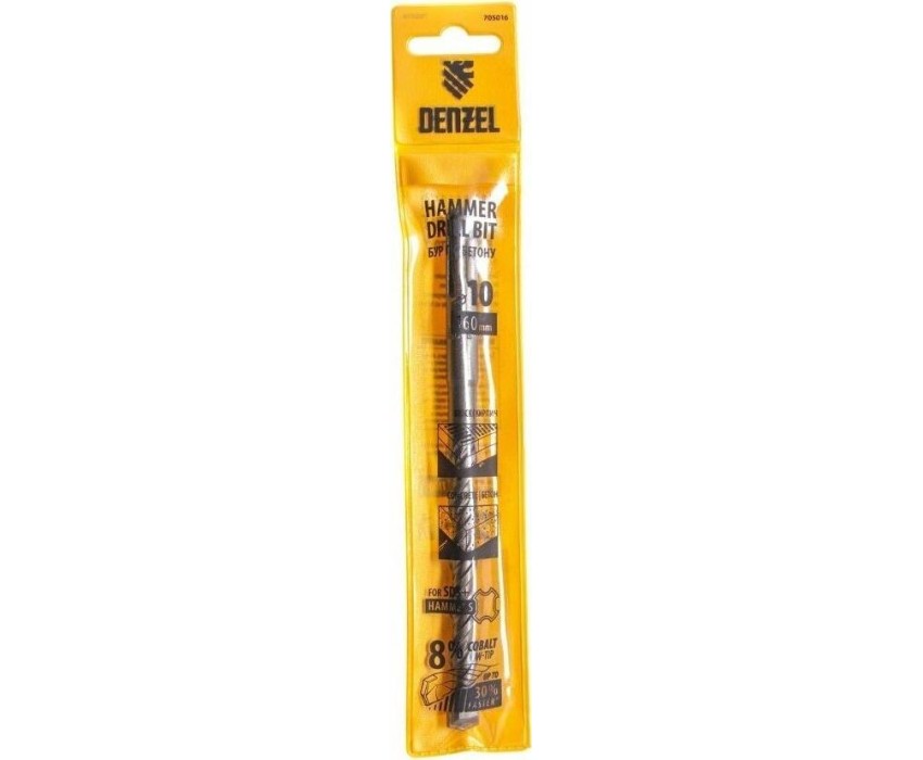 Бур по бетону Denzel арт. 705016 с хвостовиком SDS PLUS и двойной спиралью предназначен для сверления отверстий в бетоне, кирпиче и камне. Он используется в качестве оснастки для перфораторов с патроном SDS Plus. Бур оптимален для проведения строительных, ремонтных, монтажных работ.ПреимуществаВысокий ресурс — режущая твердосплавная пластина из стали ВК8 твердостью 80-90 HRC с W-образной заточкой способна сверлить отверстия до 30% быстрее, в том числе при работе с камнем.Прочность и износостойкость — рабочая часть из легированной стали 40Х выдерживает интенсивные и длительные ударные нагрузки, а также делает бур самым высокопроизводительным среди аналогов средней цены.Двойная спираль и канавка с дополнительным желобом — за счет более эффективного отвода шлама рабочая часть не перегревается, что позволяет продлить срок службы бура.Удобная упаковка с европодвесом — оснастку можно разместить на стенде.
