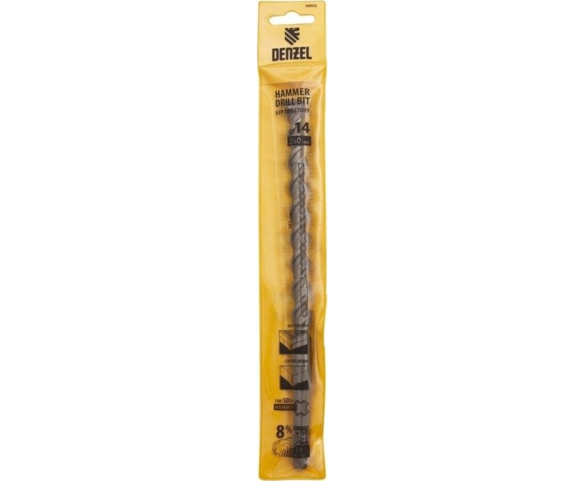Бур по бетону Denzel арт. 705032 с хвостовиком SDS PLUS и двойной спиралью предназначен для сверления отверстий в бетоне, кирпиче и камне. Он используется в качестве оснастки для перфораторов с патроном SDS Plus. Бур оптимален для проведения строительных, ремонтных, монтажных работ.ПреимуществаВысокий ресурс — режущая твердосплавная пластина из стали ВК8 твердостью 80-90 HRC с W-образной заточкой способна сверлить отверстия до 30% быстрее, в том числе при работе с камнем.Прочность и износостойкость — рабочая часть из легированной стали 40Х выдерживает интенсивные и длительные ударные нагрузки, а также делает бур самым высокопроизводительным среди аналогов средней цены.Двойная спираль и канавка с дополнительным желобом — за счет более эффективного отвода шлама рабочая часть не перегревается, что позволяет продлить срок службы бура.Удобная упаковка с европодвесом — оснастку можно разместить на стенде.