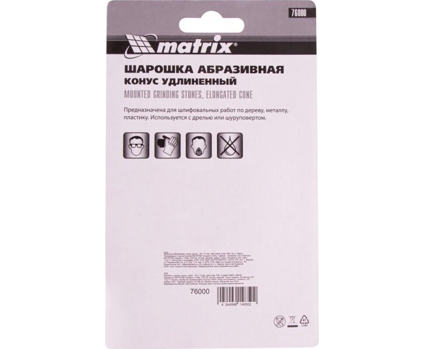 Шарошка абразивная Matrix 76000 размером 25 х 70 мм, с цилиндрическим хвостовиком 6 мм, 3 шт., имеет форму удлиненного конуса с абразивом зернистостью F46. Она устанавливается в качестве оснастки на дрель или шуруповерт. Позволяет зачищать отверстия, снимать фаски и удалить заусенцы. Шарошка рассчитана на бытовое и профессиональное применение.ПреимуществаУниверсальный абразив из оксида алюминия быстро обрабатывает любые материалы: металлические поверхности, пластик, минеральные материалы.Крупнозернистый абразив F46 эффективен для грубой шлифовки деталей.За счет длины 70 мм шарошка позволяет проникать в труднодоступные места.Трех шарошек в комплекте хватит на большой объем работ.