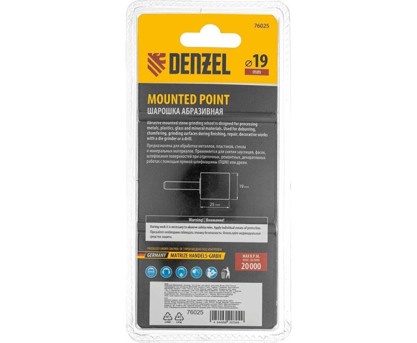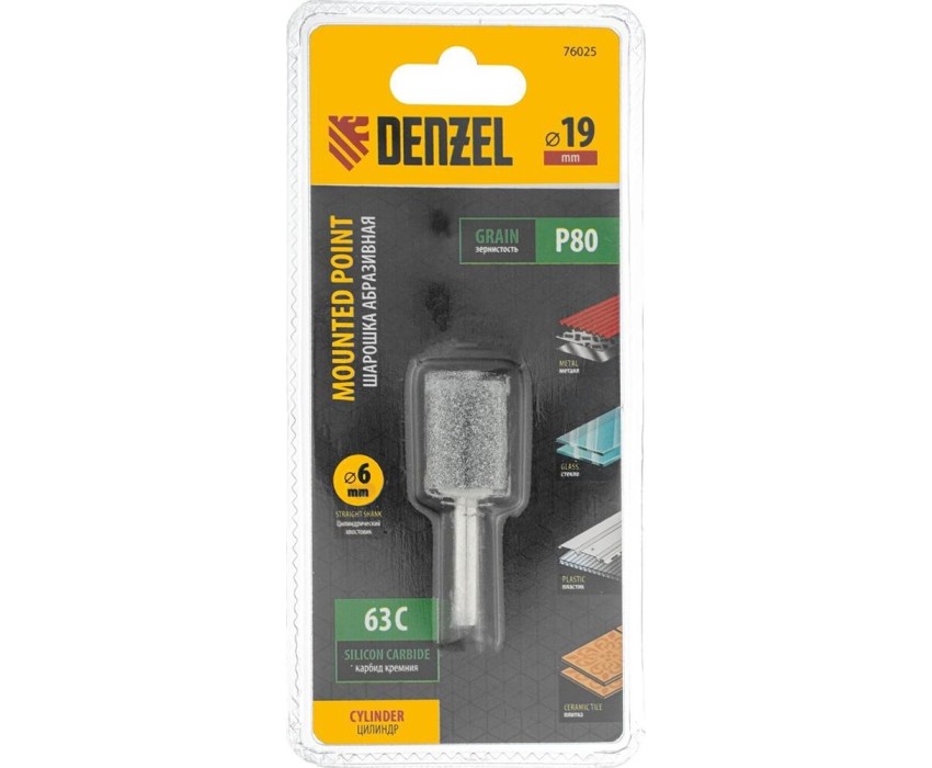 Шарошка абразивная Denzel 76025 с рабочей частью в форме цилиндра 19 х 25 мм, с хвостовиком диаметром 6 мм, устанавливается на дрель, шуруповерт или или прямошлифовальную машину (ПШМ). Удобна для зачистки ровных поверхностей, обработки сварных швов, удаления заусенцев, снятия фасок, а также для расширения отверстий и заточки лезвий режущих инструментов. Будет полезна при выполнении ремонтных, кузовных, отделочных работ.ПреимуществаДолговечность — абразив из карбида кремния (63С) обладает в 2 раза большим ресурсом, чем оксид алюминия.Универсальность — шарошка подходит для обработки металла, пластика, различных сплавов, стекла, керамической плитки, натурального и искусственного камня.Простое использование — цилиндрический хвостовик подходит для стандартных патронов дрелей и шуруповертов, а также для ПШМ с цанговым зажимом.