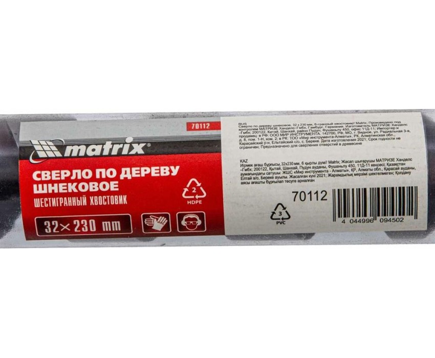 Шнековое сверло по дереву Matrix 70112 размером 32 х 230 мм, с 6-гранным хвостовиком, предназначено для получения глубоких отверстий. Подходит для работы как с мягкими, так и с твердыми породами древесины. Конструкция сверла рассчитана на интенсивное использование с высокими нагрузками в ходе строительных, ремонтных и отделочных работ.ПреимуществаПрочность и износостойкость — сверло изготовлено из инструментальной стали, а режущая часть закалена до твердости 40 HRC.Высокое качество выполняемых работ — шнек отшлифован до зеркального блеска, что позволяет получать гладкие и ровные отверстия.Глубокое сверление — массивная спираль обеспечивает эффективный отвод стружки.Удобная эксплуатация — центрирующее сверло уменьшает осевую нагрузку, облегчая засверливание и предотвращая смещение оснастки.Шестигранный хвостовик — сверло не проворачивается в патроне дрели.