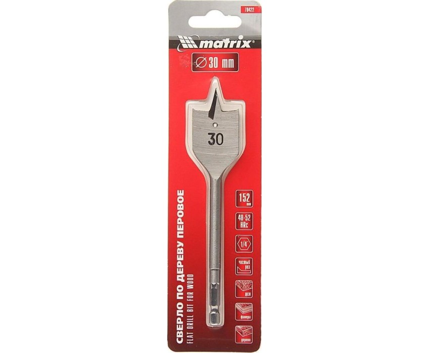 Перовое сверло по дереву Matrix 70422 диаметром 30 мм, с 6-гранным хвостовиком, имеет рабочую часть в виде «лопатки» с режущими кромками по бокам, поэтому эффективно для сверления глубоких сквозных и глухих отверстий. Оснастка устанавливается на ручную механическую или электрическую дрель, сверлильный станок, с ее помощью можно сверлить древесину любых пород.ПреимуществаПрочность и износостойкость — сверло выполнено из стали 45, режущие кромки закалены до твердости 48-52 HRC.Высокое качество проводимых работ — благодаря подрезателям на режущей части края отверстий получаются ровными.Возможность увеличить глубину сверления — оснастка совместима с удлинителем Matrix 70495.Комфортная работа — шестигранный хвостовик не проворачивается в патроне инструмента.