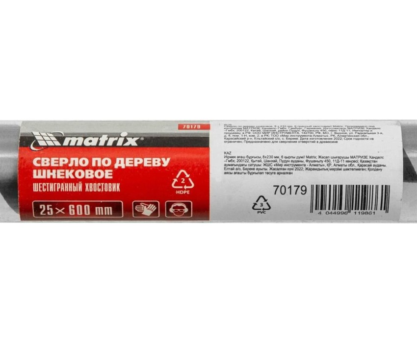Шнековое сверло по дереву Matrix 70179 размером 25 х 600 мм, с 6-гранным хвостовиком, предназначено для получения глубоких отверстий. Подходит для работы как с мягкими, так и с твердыми породами древесины. Конструкция сверла рассчитана на интенсивное использование с высокими нагрузками в ходе строительных, ремонтных и отделочных работ.ПреимуществаПрочность и износостойкость — сверло изготовлено из инструментальной стали, а режущая часть закалена до твердости 40 HRC.Высокое качество выполняемых работ — шнек отшлифован до зеркального блеска, что позволяет получать гладкие и ровные отверстия.Глубокое сверление — массивная спираль обеспечивает эффективный отвод стружки.Удобная эксплуатация — центрирующее сверло уменьшает осевую нагрузку, облегчая засверливание и предотвращая смещение оснастки.Шестигранный хвостовик — сверло не проворачивается в патроне дрели.