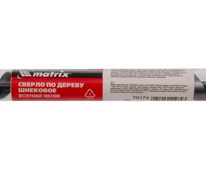 Шнековое сверло по дереву Matrix 70174 размером 16 х 600 мм, с 6-гранным хвостовиком, предназначено для получения глубоких отверстий. Подходит для работы как с мягкими, так и с твердыми породами древесины. Конструкция сверла рассчитана на интенсивное использование с высокими нагрузками в ходе строительных, ремонтных и отделочных работ.ПреимуществаПрочность и износостойкость — сверло изготовлено из инструментальной стали, а режущая часть закалена до твердости 40 HRC.Высокое качество выполняемых работ — шнек отшлифован до зеркального блеска, что позволяет получать гладкие и ровные отверстия.Глубокое сверление — массивная спираль обеспечивает эффективный отвод стружки.Удобная эксплуатация — центрирующее сверло уменьшает осевую нагрузку, облегчая засверливание и предотвращая смещение оснастки.Шестигранный хвостовик — сверло не проворачивается в патроне дрели.