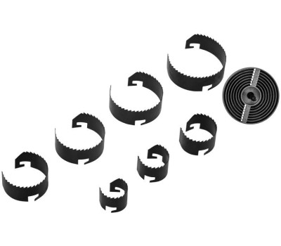 Кольцевая пила состоит из держателя и коронок диаметром 26, 32, 38, 45, 50, 56, 63 мм, позволяющих вырезать круглые отверстия глубиной до 1 дюйма в дереве, ДВП и ДСП. Пила применяется при проведении работ по выводу труб через перегородки, а также при установке осветительных систем, розеток и выключателей. Используется в качестве оснастки для ручных и электрических дрелей. Хвостовик – цилиндрический. Режущие полотна изготовлены из высокоуглеродистой марганцевой стали марки 65Г, поэтому характеризуются высокими показателями износостойкости и остроты режущей кромки. Инструмент комплектуется направляющим сверлом, облегчающим центровку отверстия. На корпус держателя нанесены обозначения диаметров, что упрощает установку коронок. По окончании работ все полотна вставляются в держатель, что обеспечивает удобство хранения. Комплектация: кольцевые пилы диаметром 26, 32, 38, 45, 50, 56, 63 мм, держатель, центрирующее сверло.