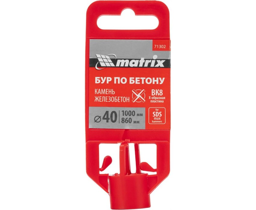 Бур по бетону Matrix 71302 длиной 1000 мм, с хвостовиком SDS MAX и крестовой пластиной, — оснастка для перфораторов высокой мощности, предназначенная для получения отверстий диаметром 40 мм в стенах, полах, перекрытиях. Крестовая пластина в сочетании с усиленной системой крепления SDS MAX позволяет успешно работать с камнем, кирпичом и бетоном, в том числе армированным. Бур используется во время проведения строительных работ, незаменим для прокладки коммуникаций: газо- и водопроводов, электросетей и т.д.