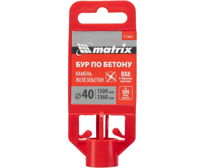 Бур по бетону Matrix 71364 длиной 1500 мм, с хвостовиком SDS MAX и крестовой пластиной, — оснастка для перфораторов высокой мощности, предназначенная для получения отверстий диаметром 40 мм в стенах, полах, перекрытиях. Крестовая пластина в сочетании с усиленной системой крепления SDS MAX позволяет успешно работать с камнем, кирпичом и бетоном, в том числе армированным. Бур используется во время проведения строительных работ, незаменим для прокладки коммуникаций: газо- и водопроводов, электросетей и т.д.