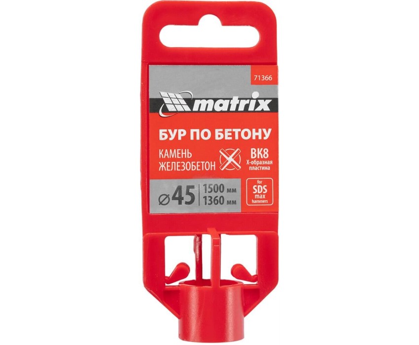 Бур по бетону Matrix 71366 длиной 1500 мм, с хвостовиком SDS MAX и крестовой пластиной, — оснастка для перфораторов высокой мощности, предназначенная для получения отверстий диаметром 45 мм в стенах, полах, перекрытиях. Крестовая пластина в сочетании с усиленной системой крепления SDS MAX позволяет успешно работать с камнем, кирпичом и бетоном, в том числе армированным. Бур используется во время проведения строительных работ, незаменим для прокладки коммуникаций: газо- и водопроводов, электросетей и т.д.