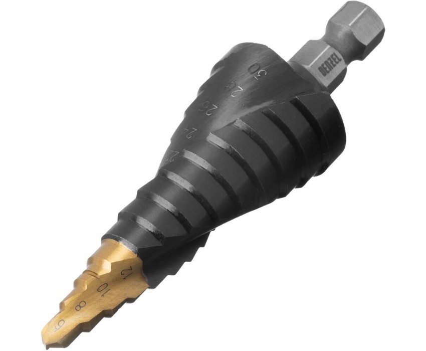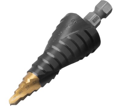Сверло DENZEL Сверло ступенчатое, 6-8-10-12-14-16-18-20-22-24-26-28-30мм, Р6М5, 6-гр. хвостовик 723604