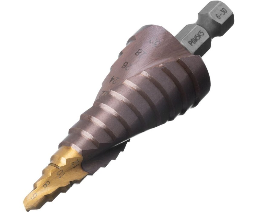 Сверло DENZEL Сверло ступенчатое, 6-8-10-12-14-16-18-20-22-24-26-28-30мм, Р6М5К5, 6-гр. хвостовик 723614